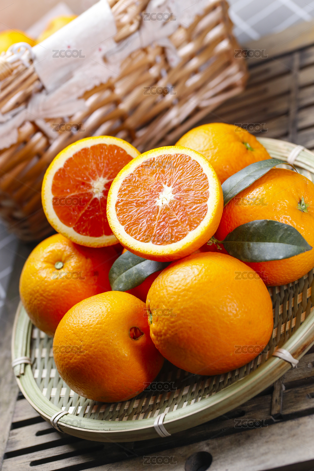 木桌上放在竹筐里的多个切开的雷波脐橙
