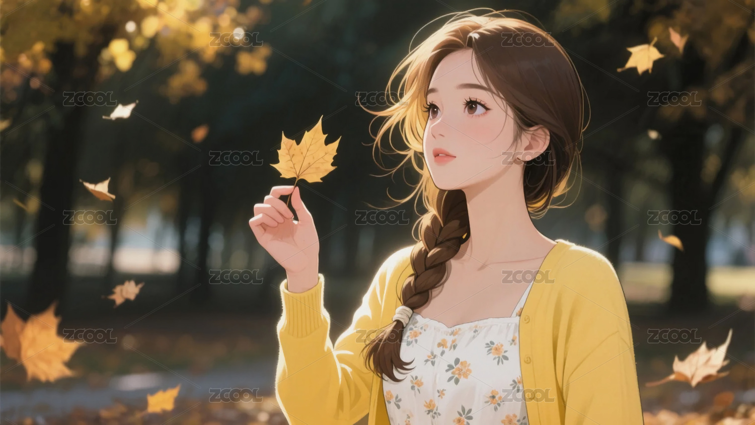秋叶,落叶,枫叶,女子,微笑,长发,美女,漂亮,温柔,阳光