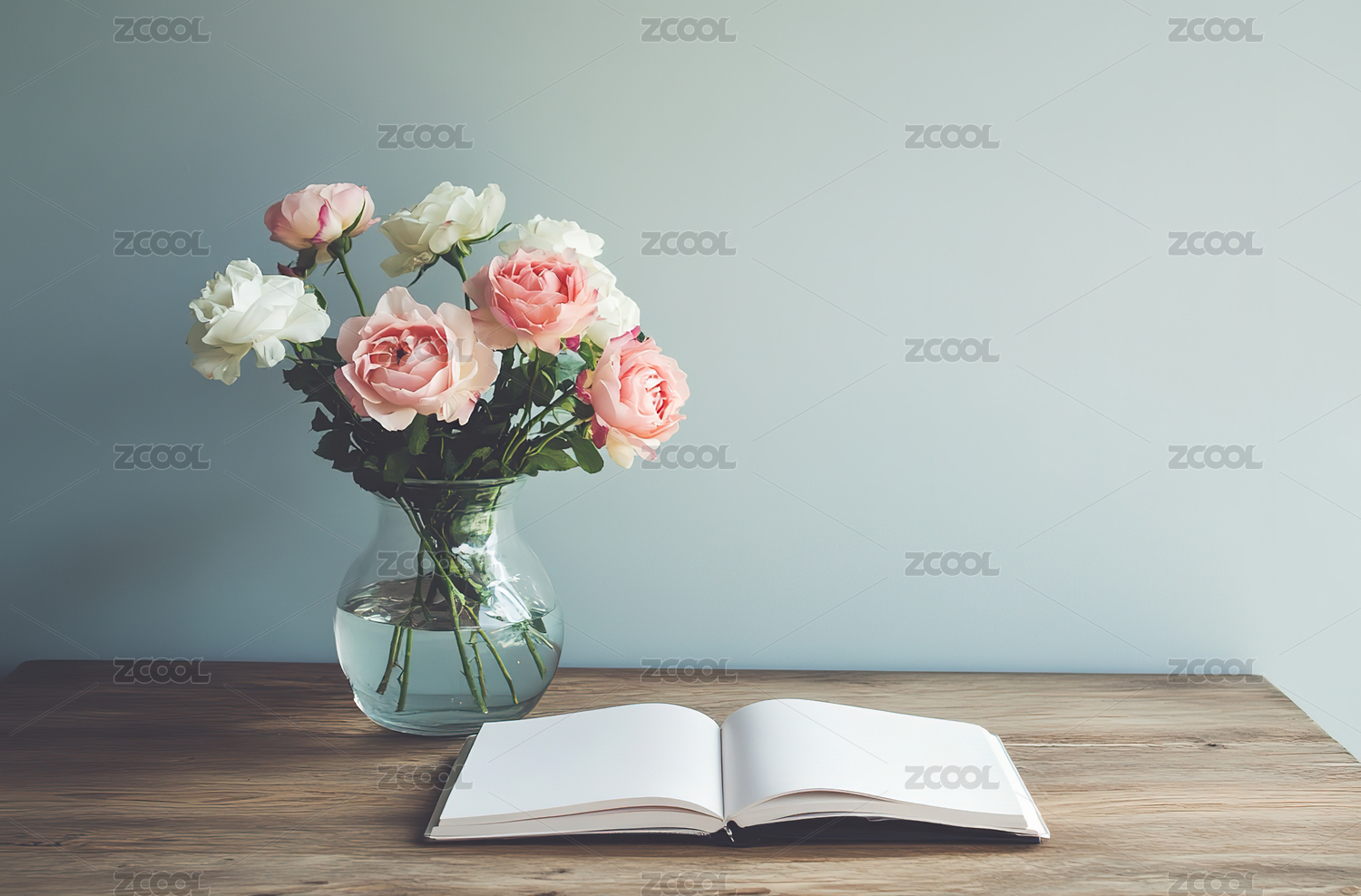 木桌玫瑰插花与翻开书本营造文艺氛围