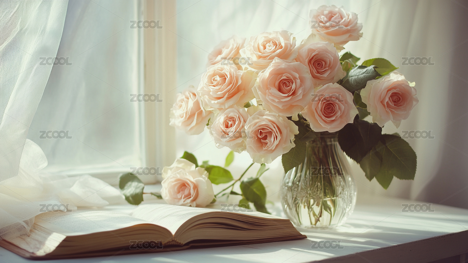 花,鲜花,花瓶,玫瑰花,书本,书籍