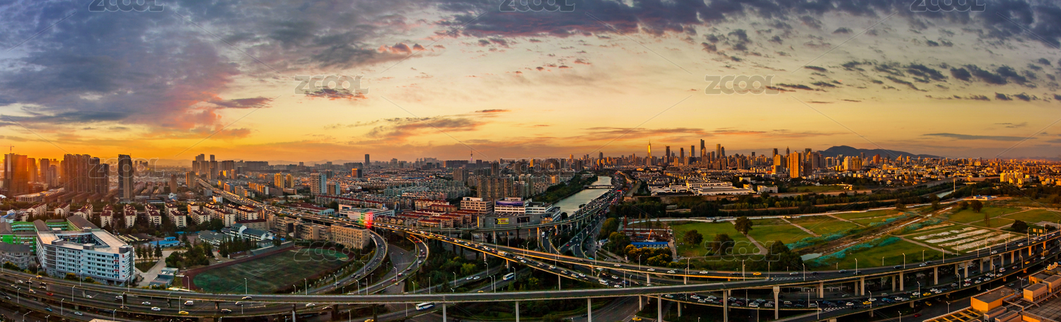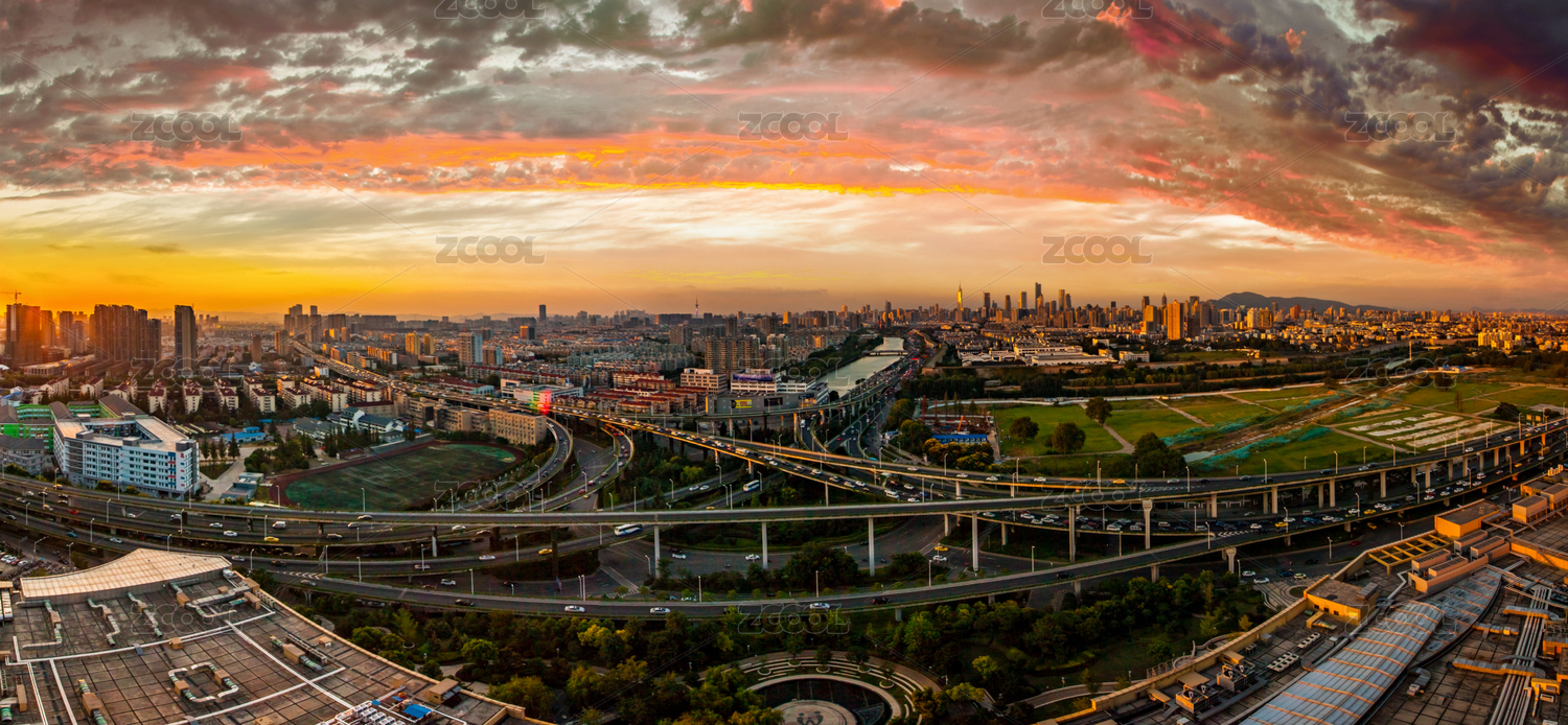日落时分中国江苏南京油坊桥立交与远处的河西金融城