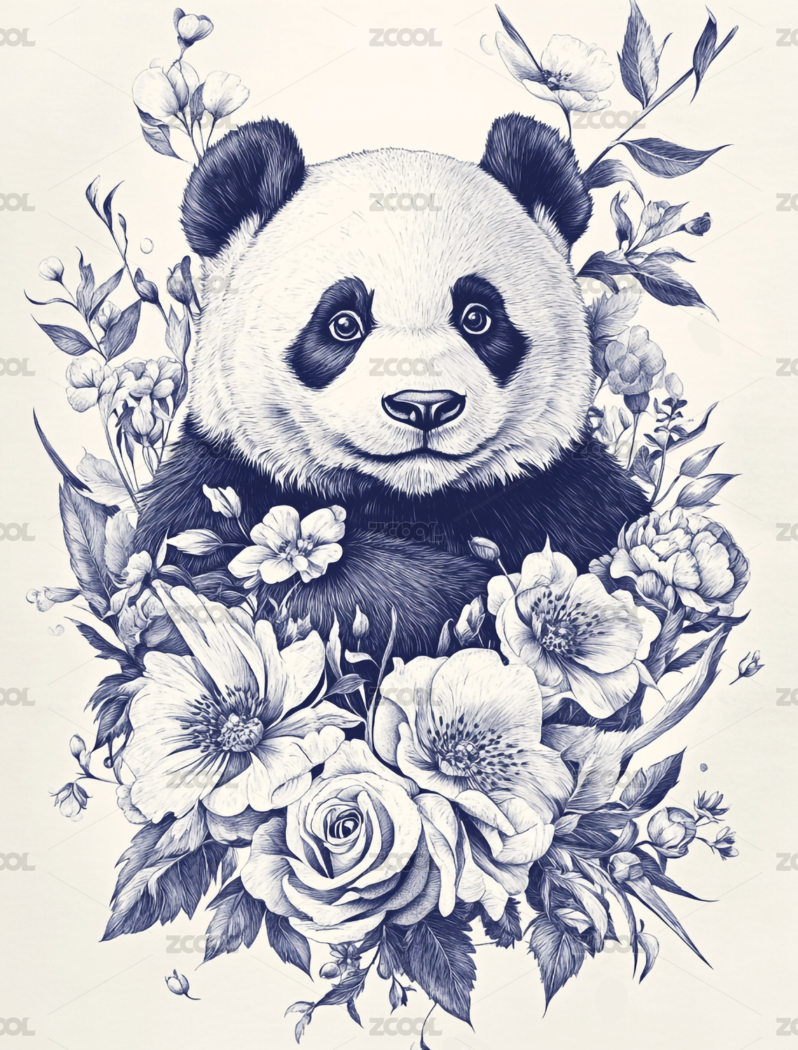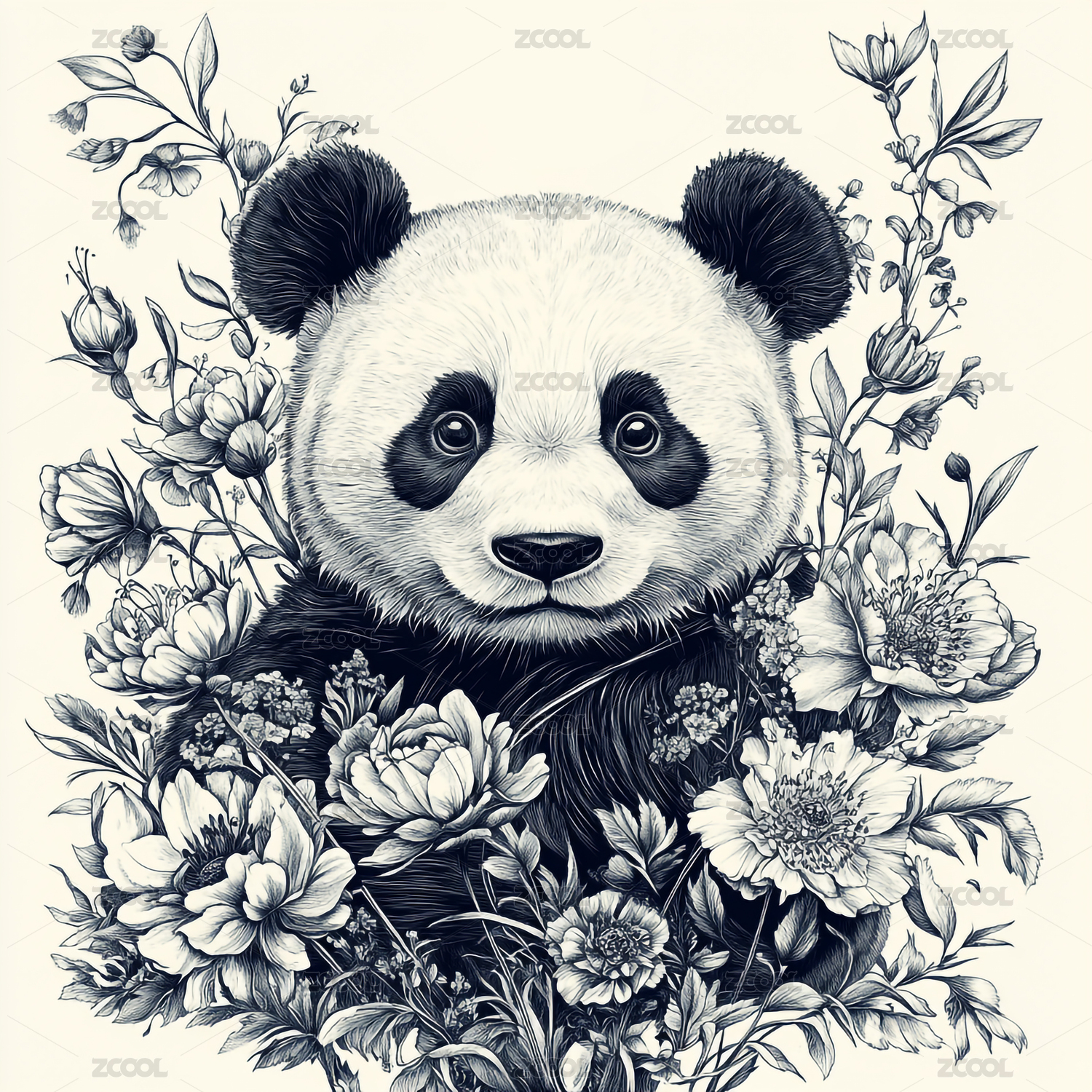复古卡通中国风线描熊猫花卉装饰插画