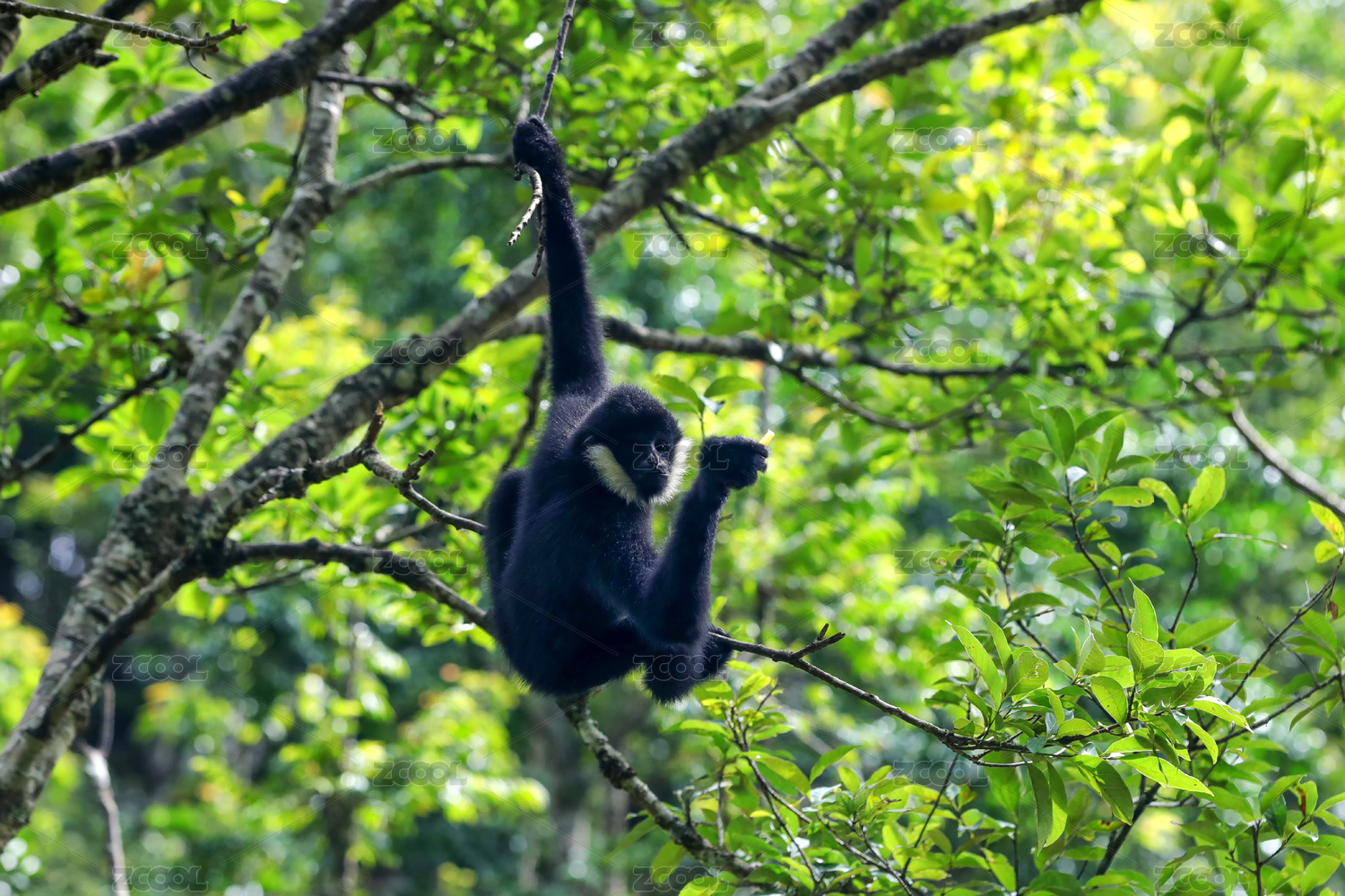 一只白颊长臂猿在丛林间跳跃嬉戏