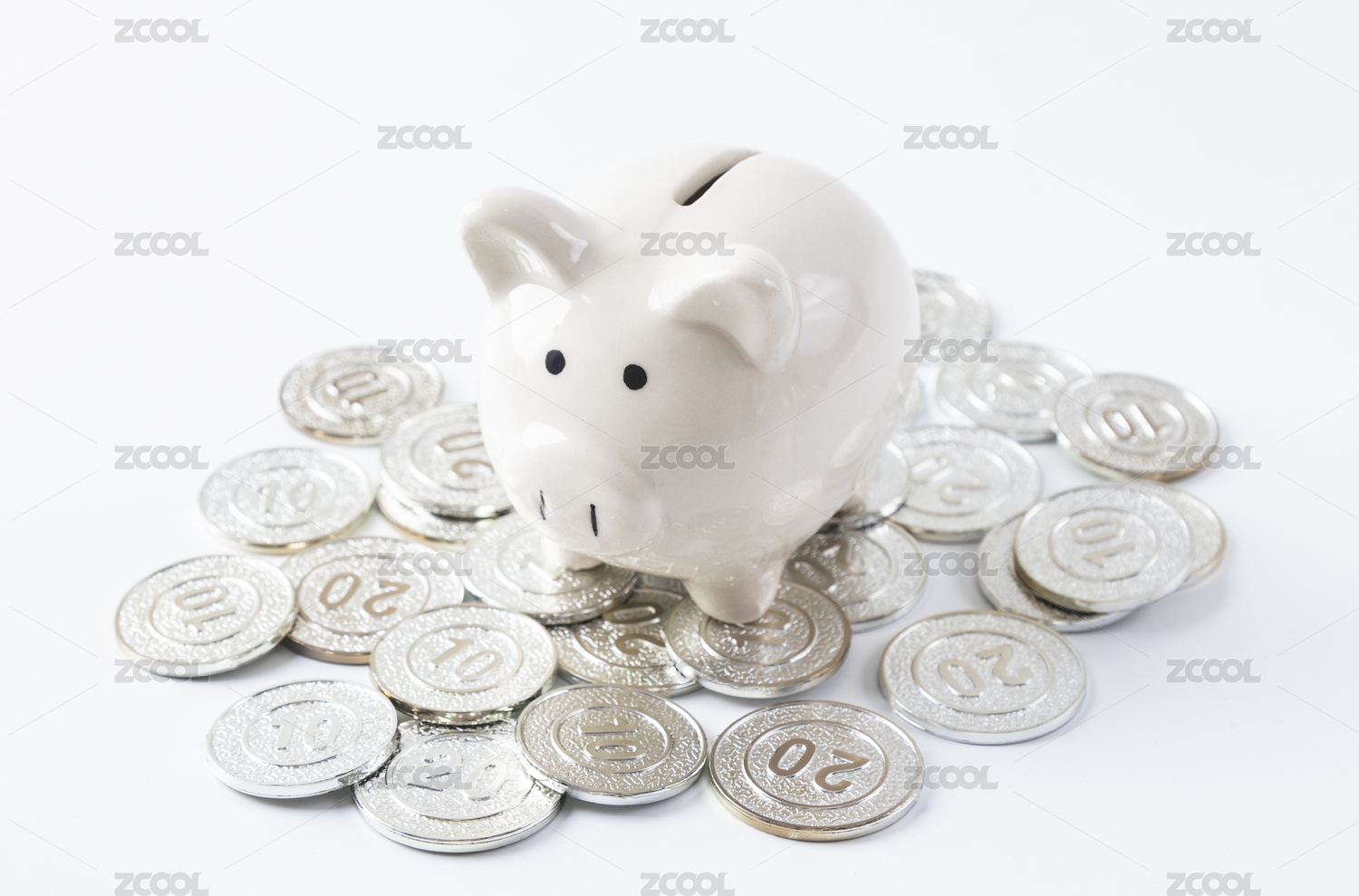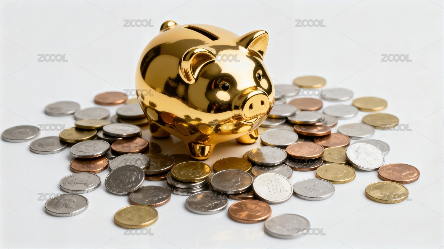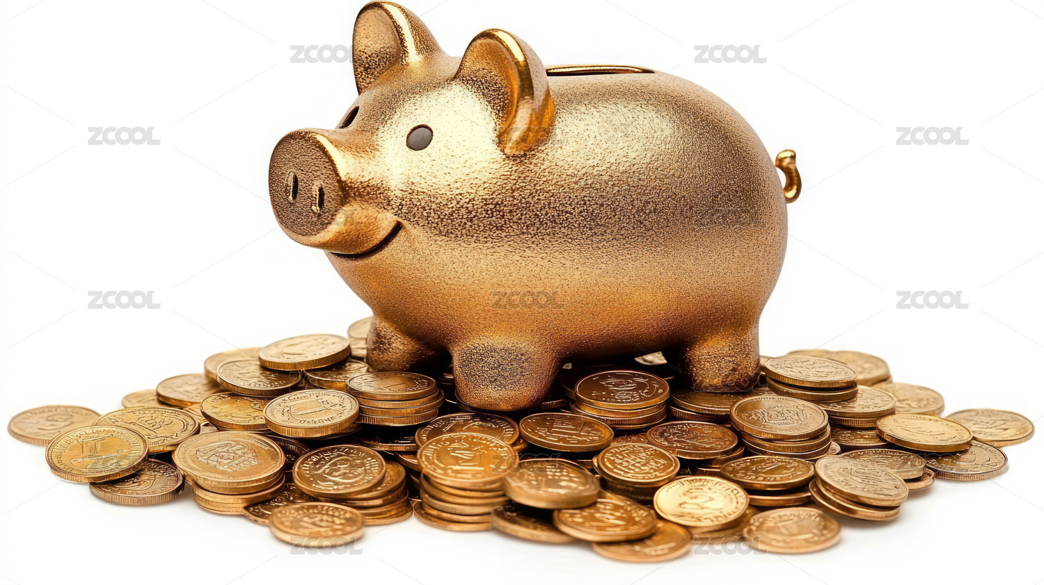 放在一堆货币上的金色小猪存钱罐,金融理财