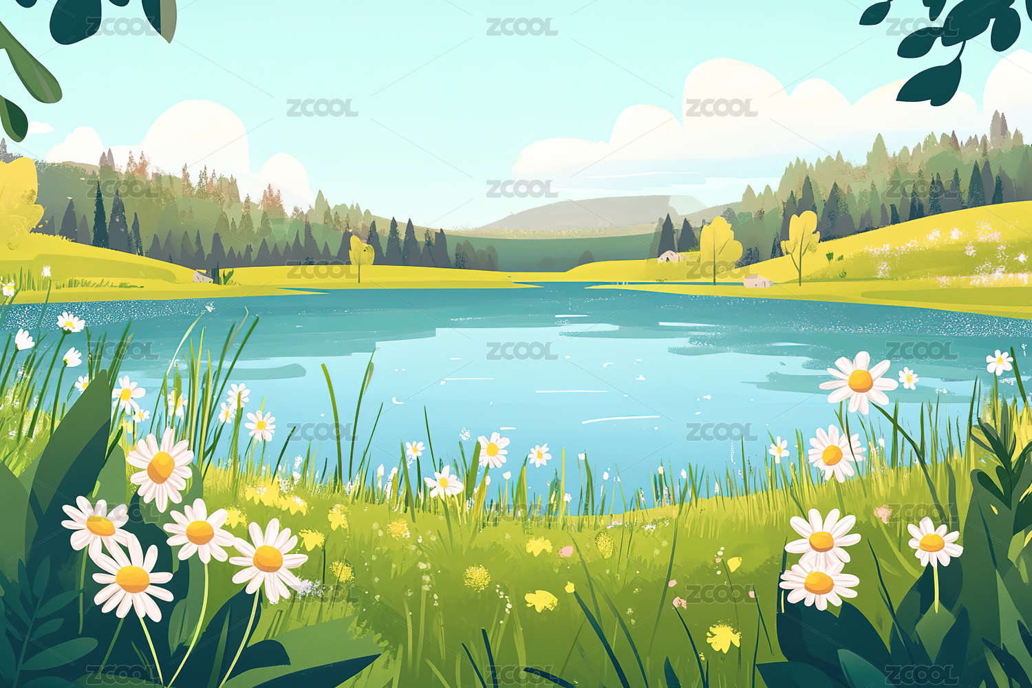 春天的花朵和池塘