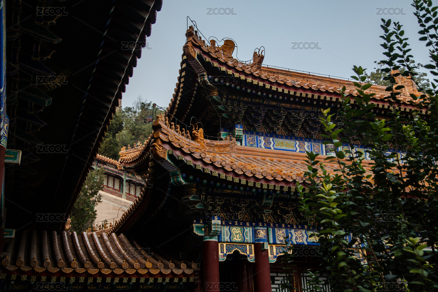 中国北京景山公园古建一角—琉璃瓦屋顶飞檐彩绘描金万字纹龙纹