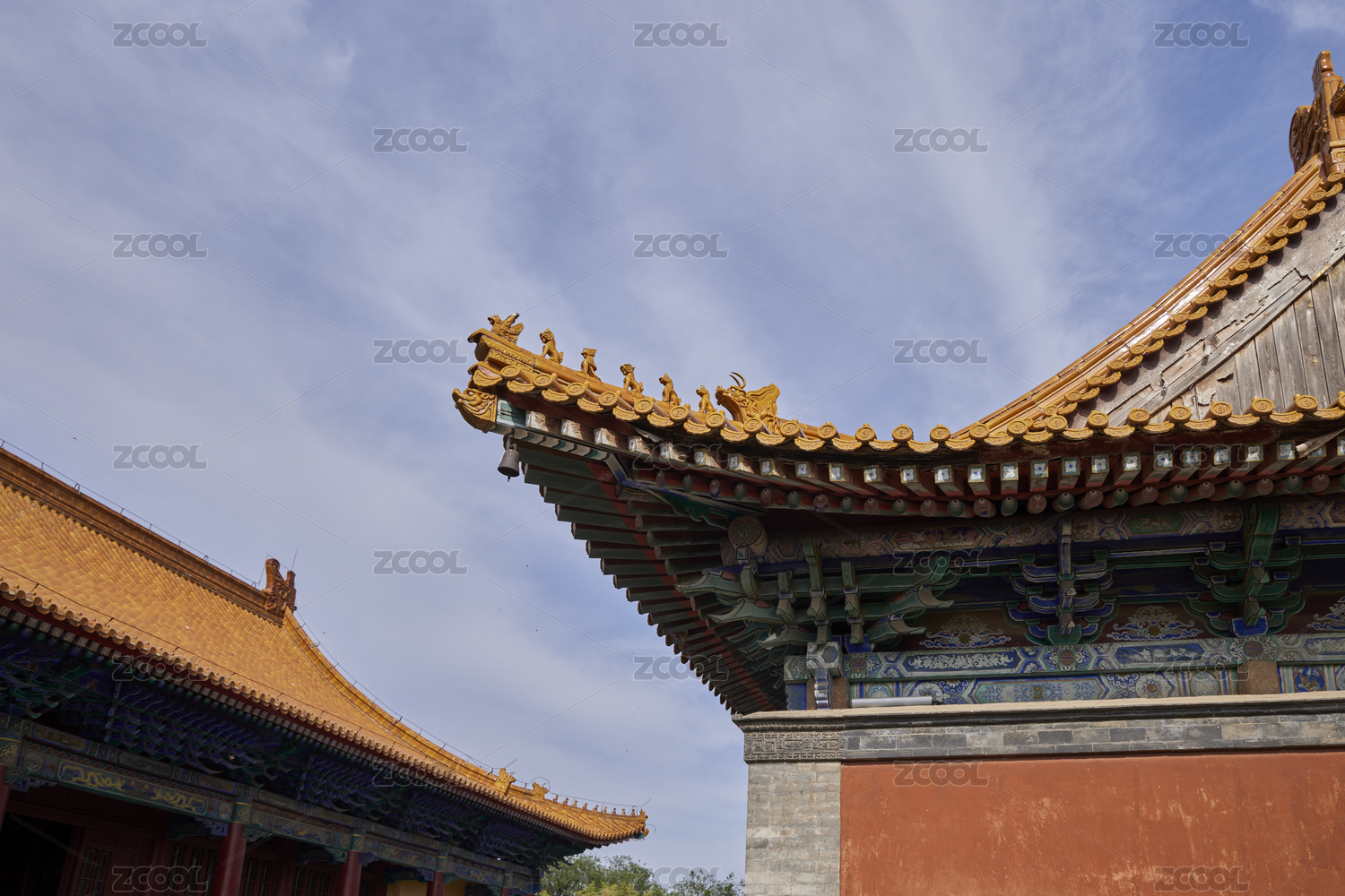 中国北京景山公园古建正面一角—琉璃瓦屋顶飞檐彩绘描金万字纹龙纹