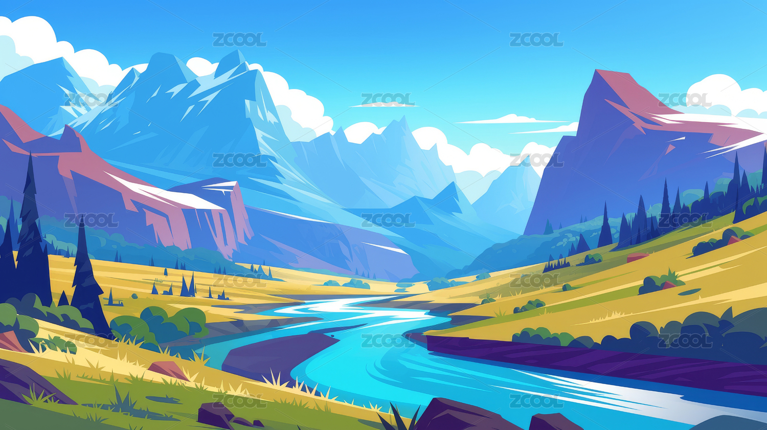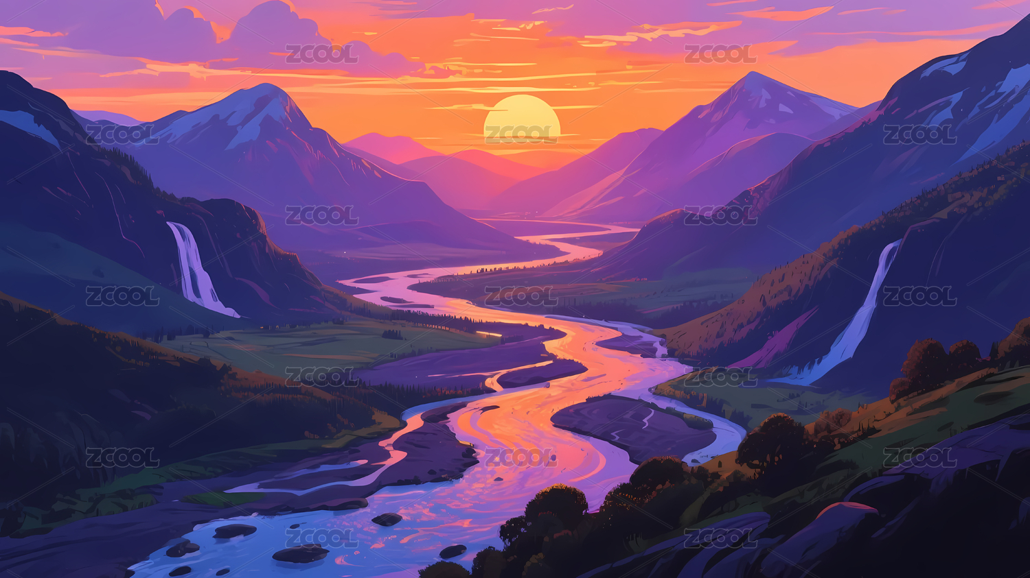 抽象彩色河流山脉风景插画