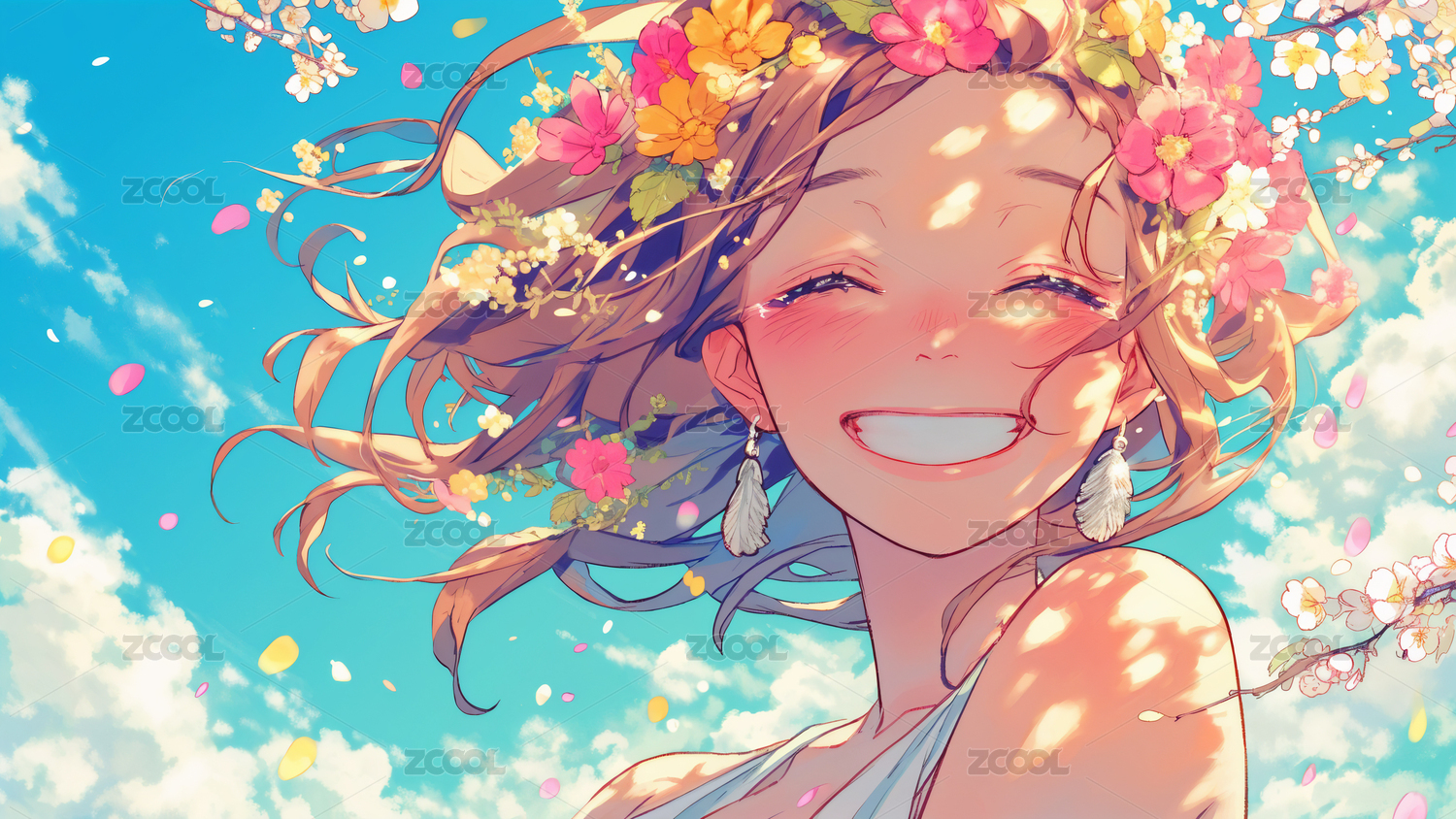 鲜花中的可爱卡通少女