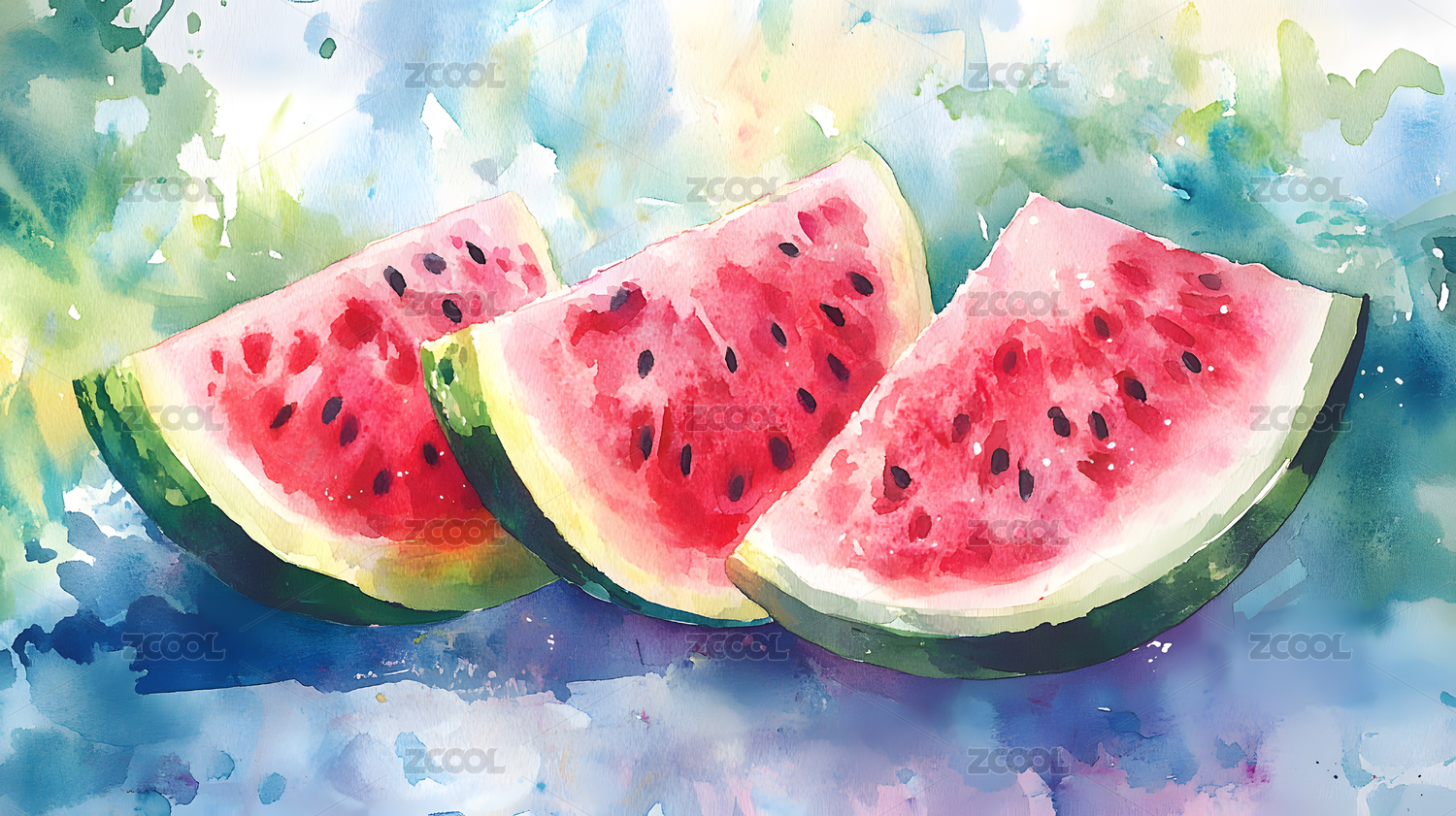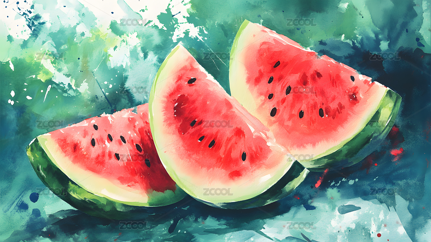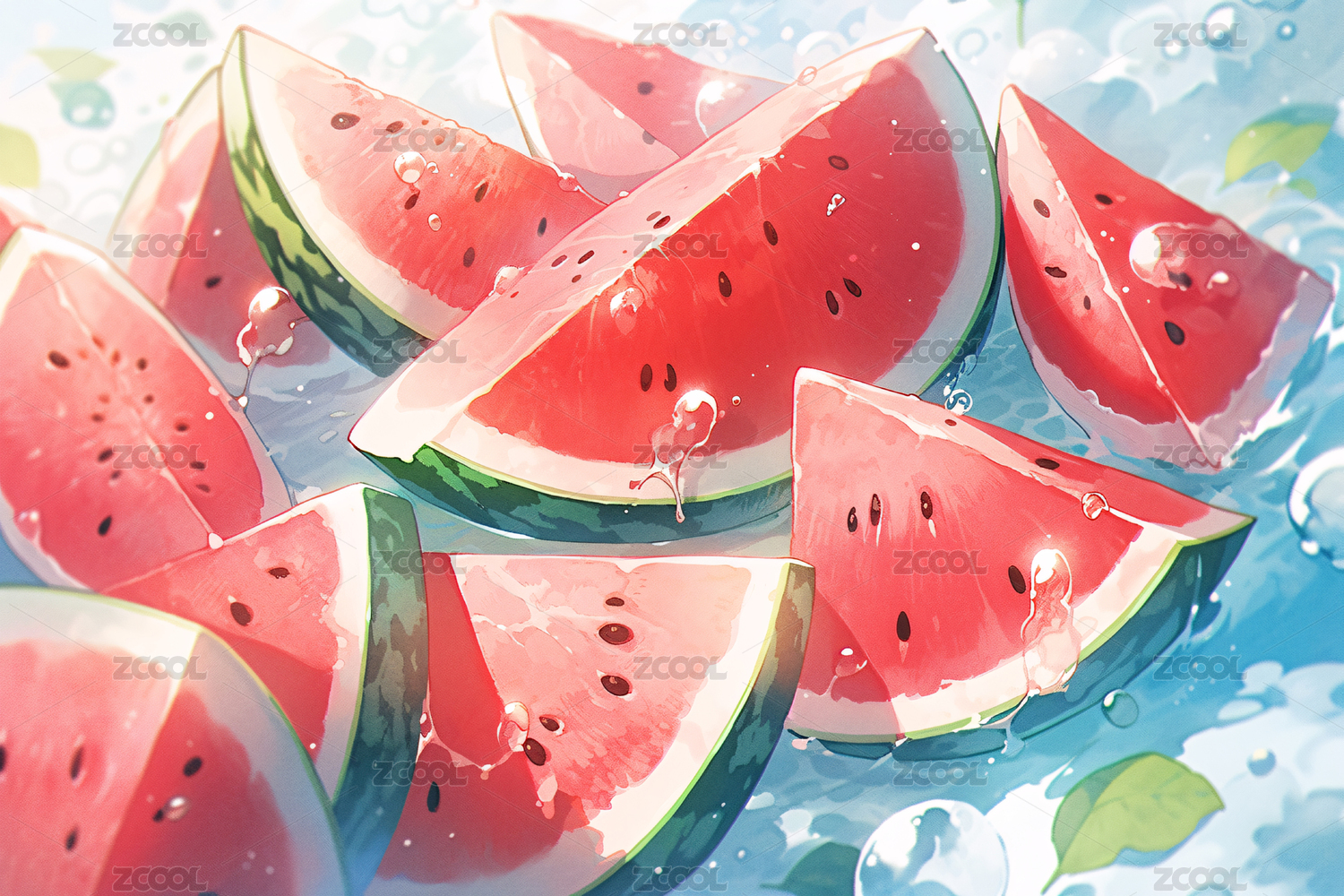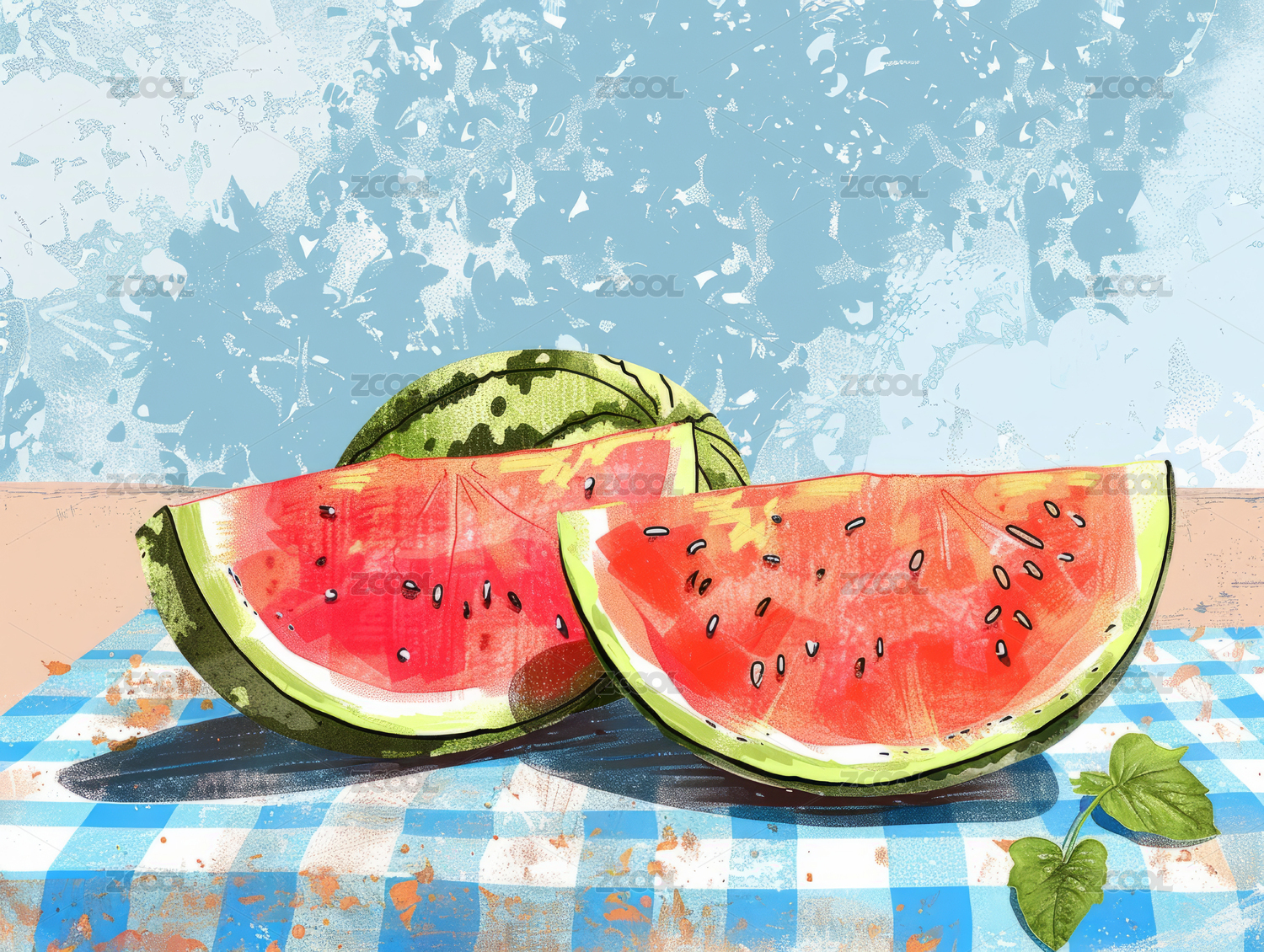 夏天清爽西瓜插画,立夏节气西瓜美食场景插