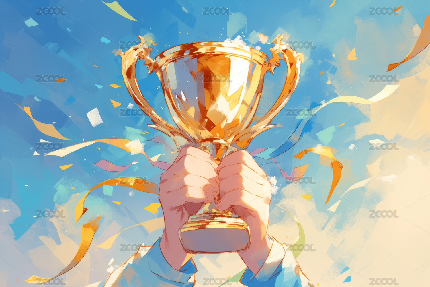 手,金色,奖杯,举起,光亮,背景,彩色,手柄,方形底座,人类