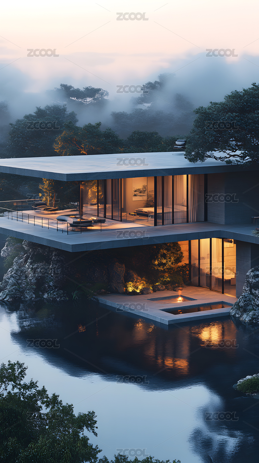 雾中悬崖峭壁现代别墅夜景
