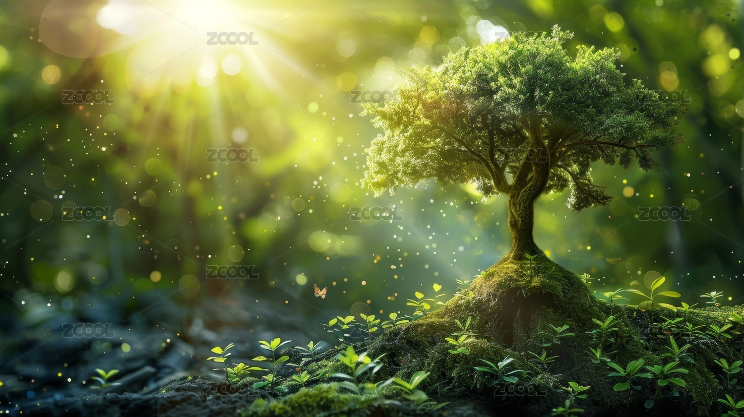 阳光下的古树与翠绿森林