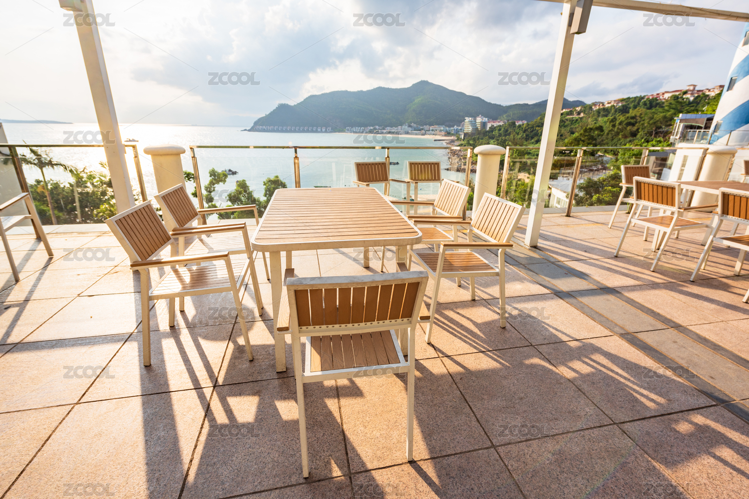 中国深圳南澳海贝湾午后阳光下的海景餐厅