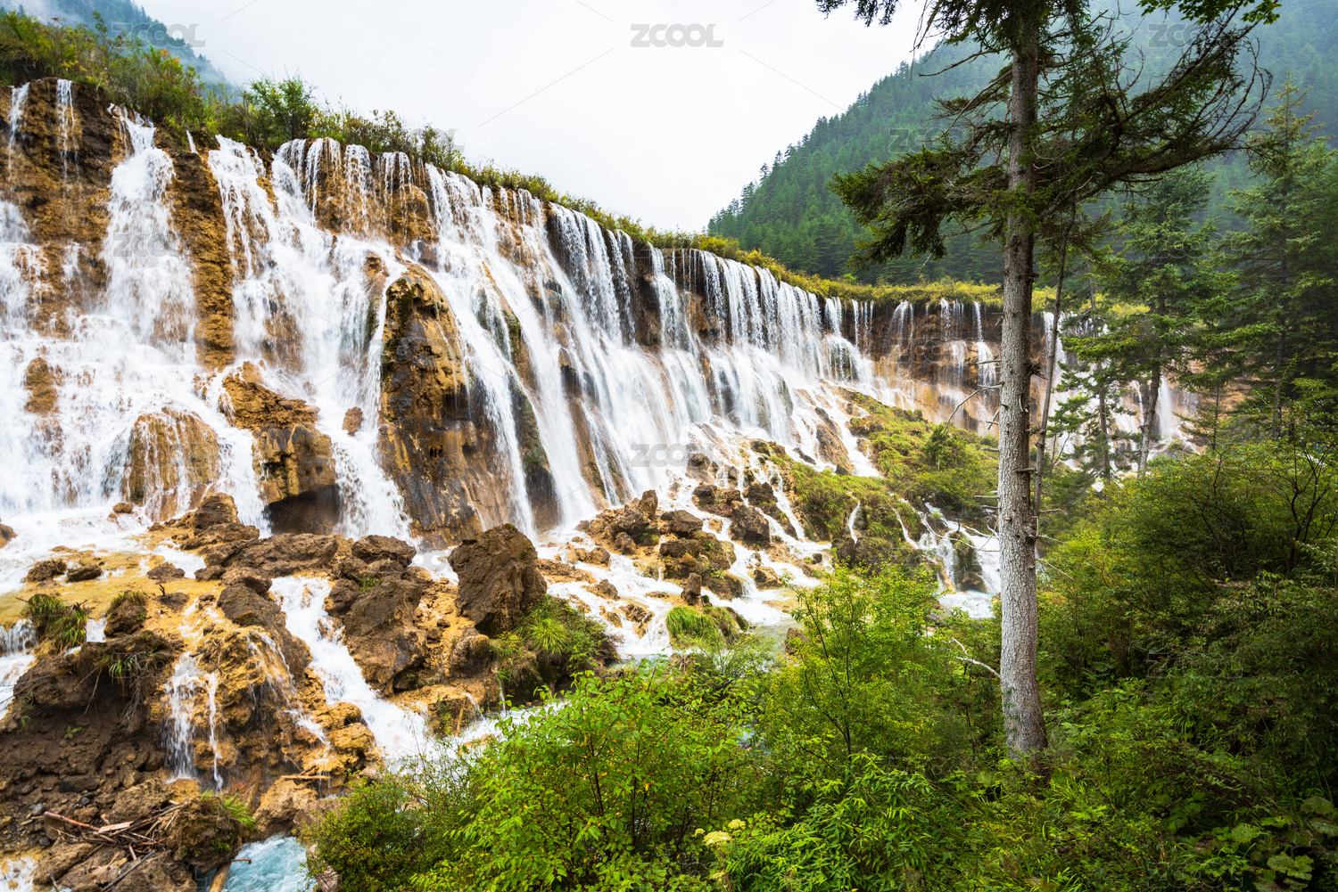 四川,九寨沟,瀑布,水流,白色,树木,断层,火花海,云杉,落差