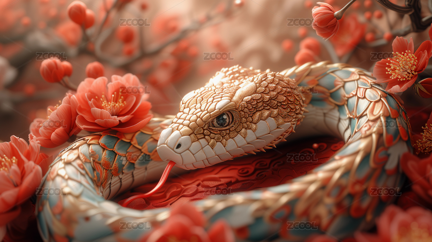 国风喜庆红色背景花丛金色蛇3D立体插画