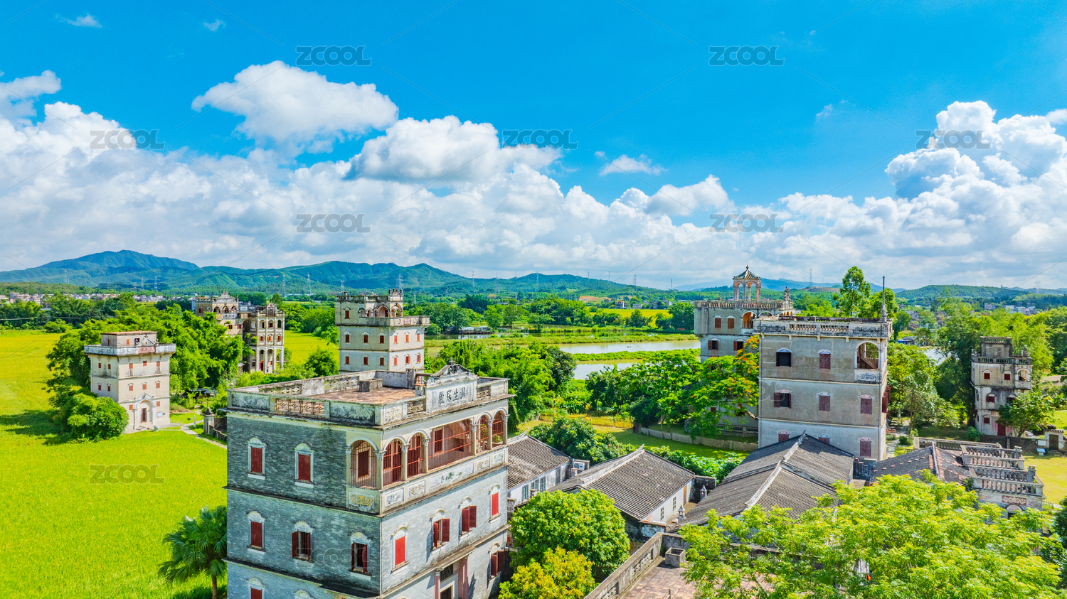 蓝天白云下的广东江门开平碉楼群碉庄