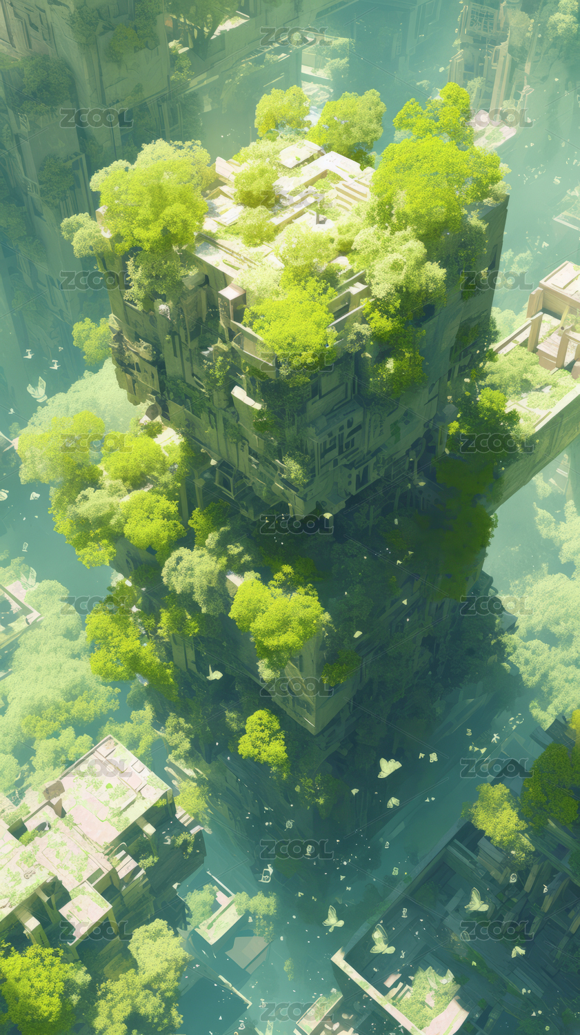 水下被自然侵蚀的城市 沉没的绿色建筑