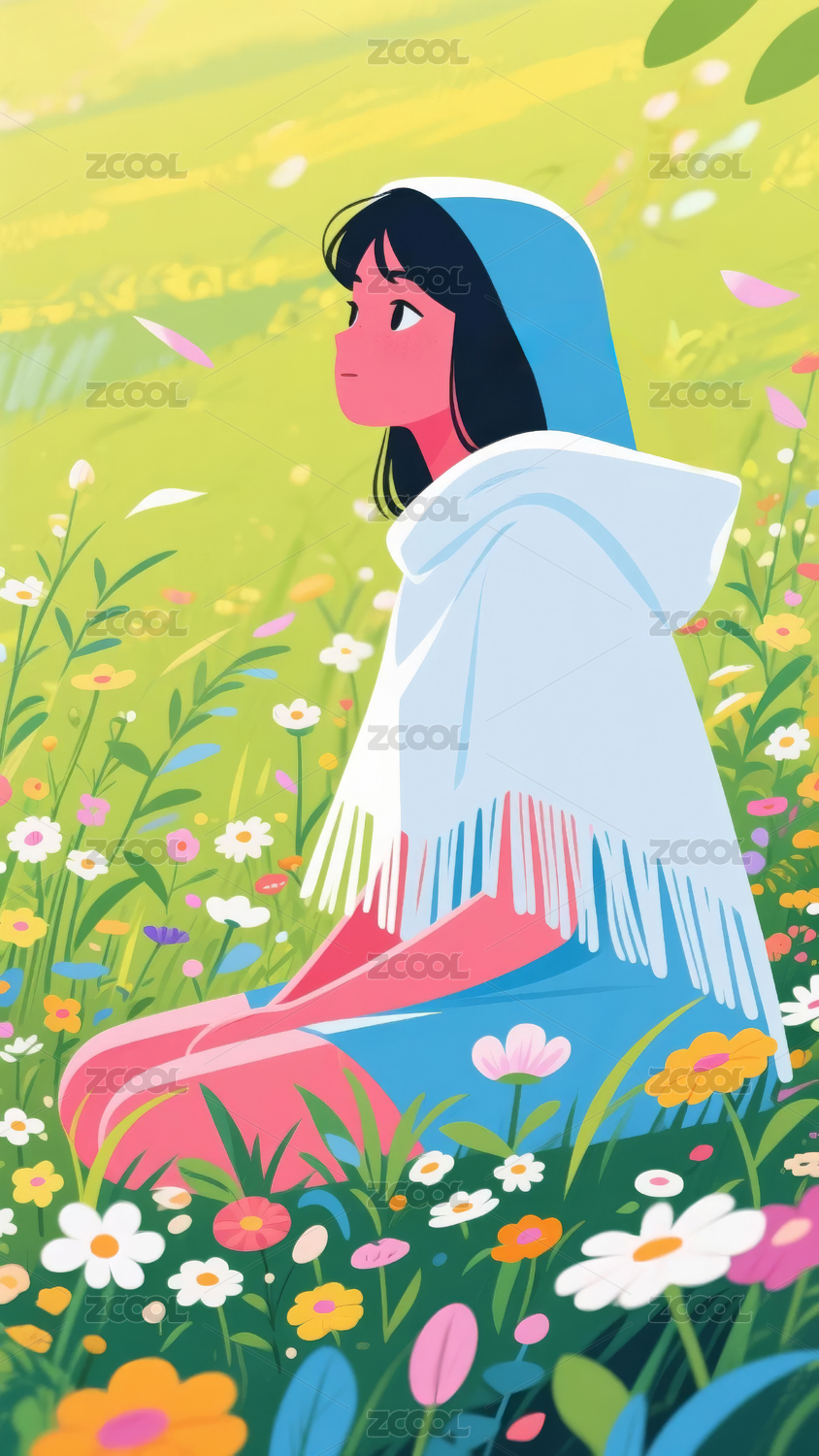 女孩坐在草丛休息手绘插画