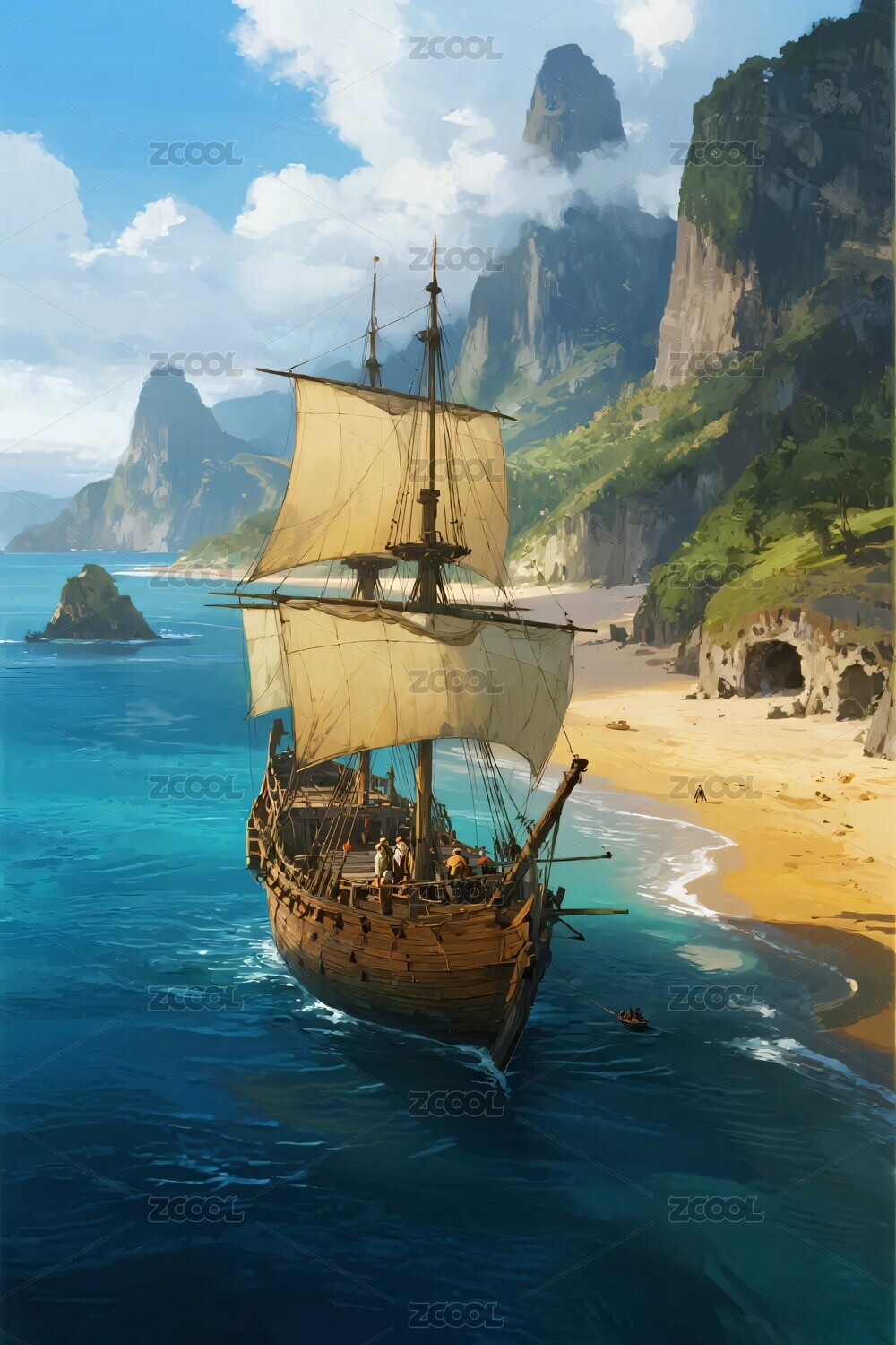 海盗船停泊热带岛屿