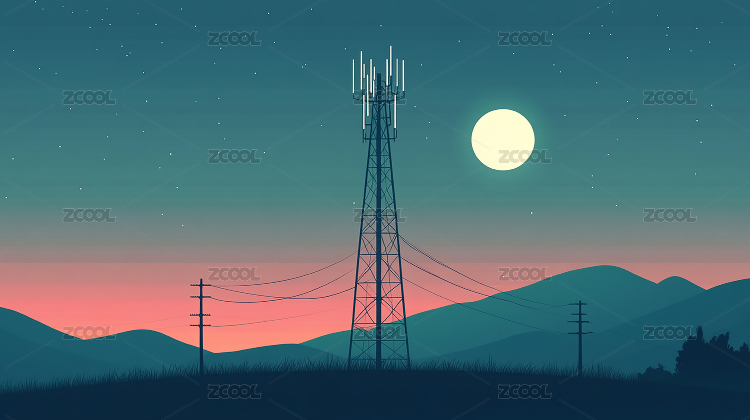 夜空下的高压电塔与明月