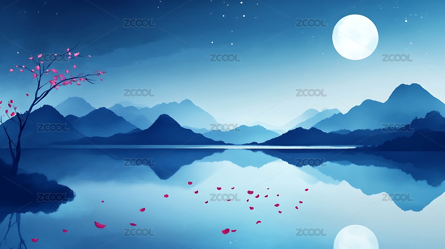 夜空下山水湖泊与月亮星空倒影宁静风景插画