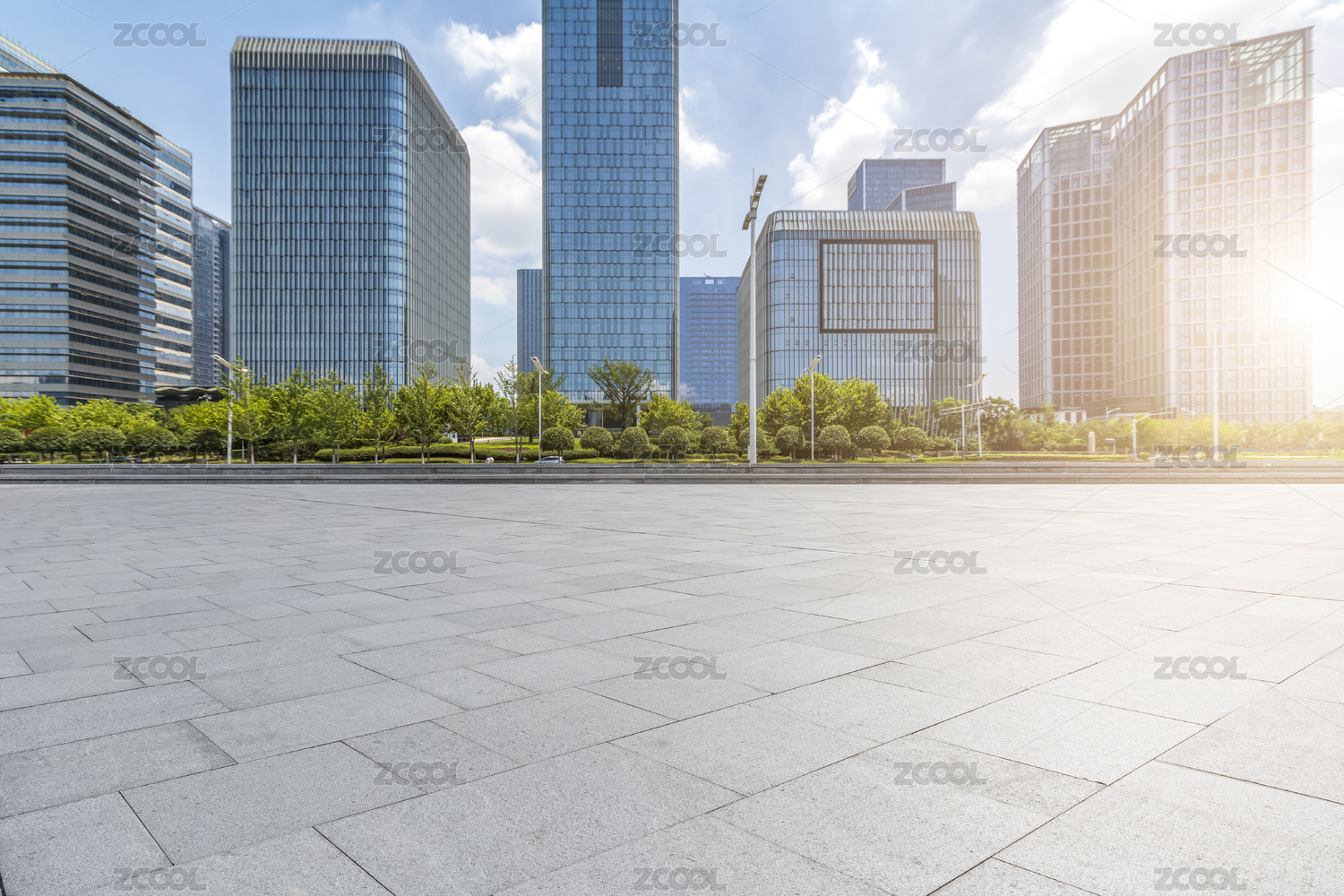 广场砖路面和杭州现代建筑背景