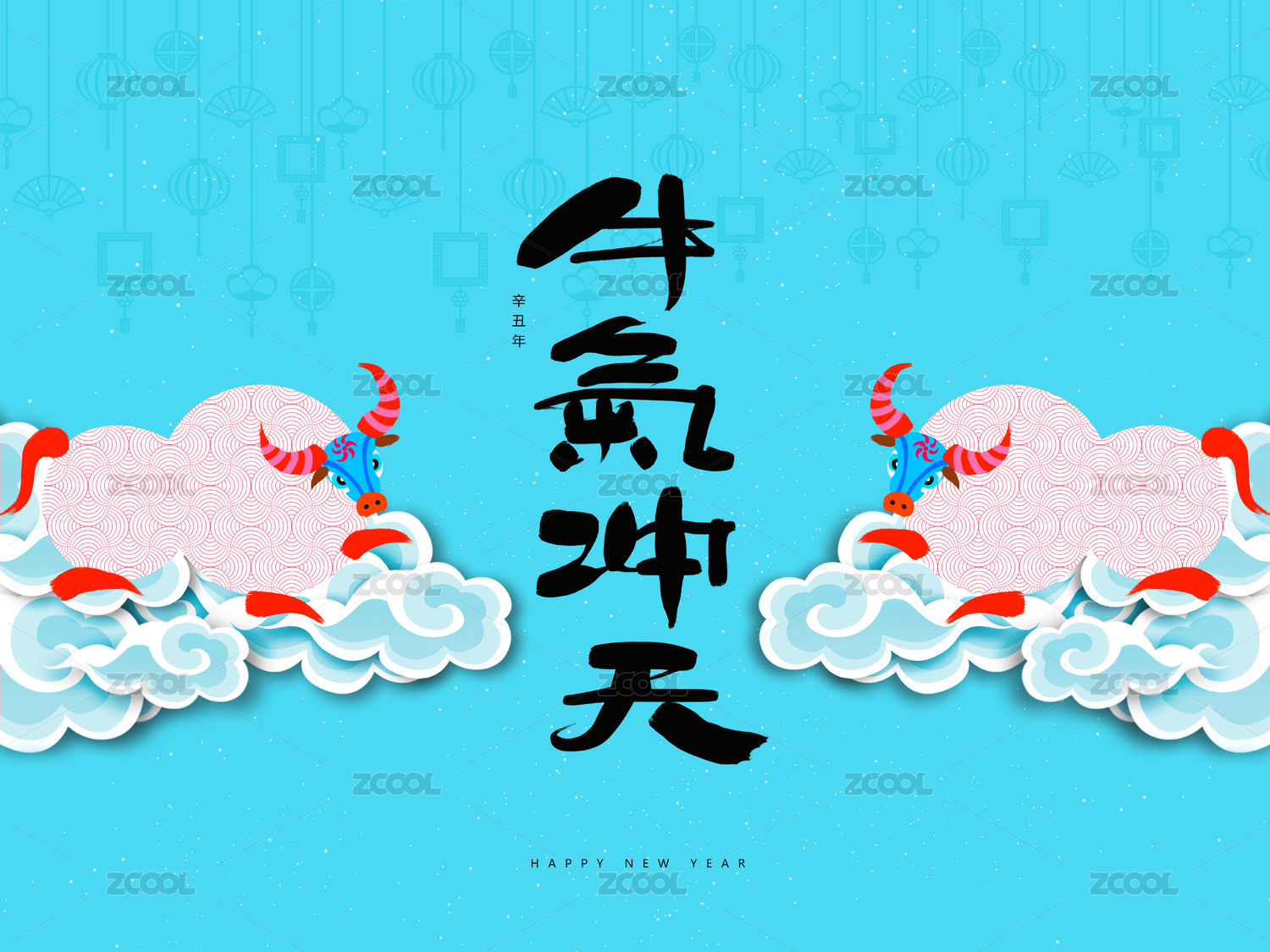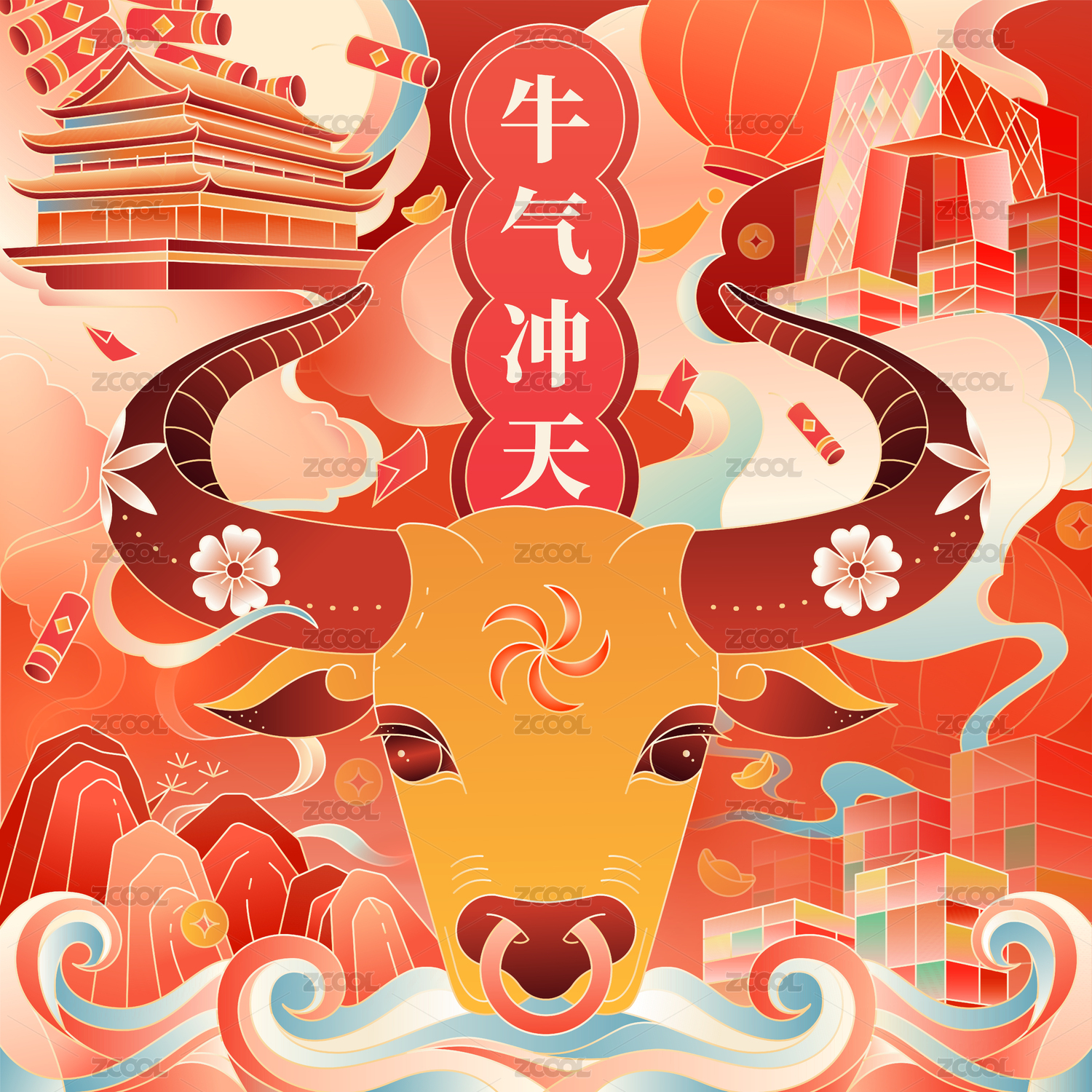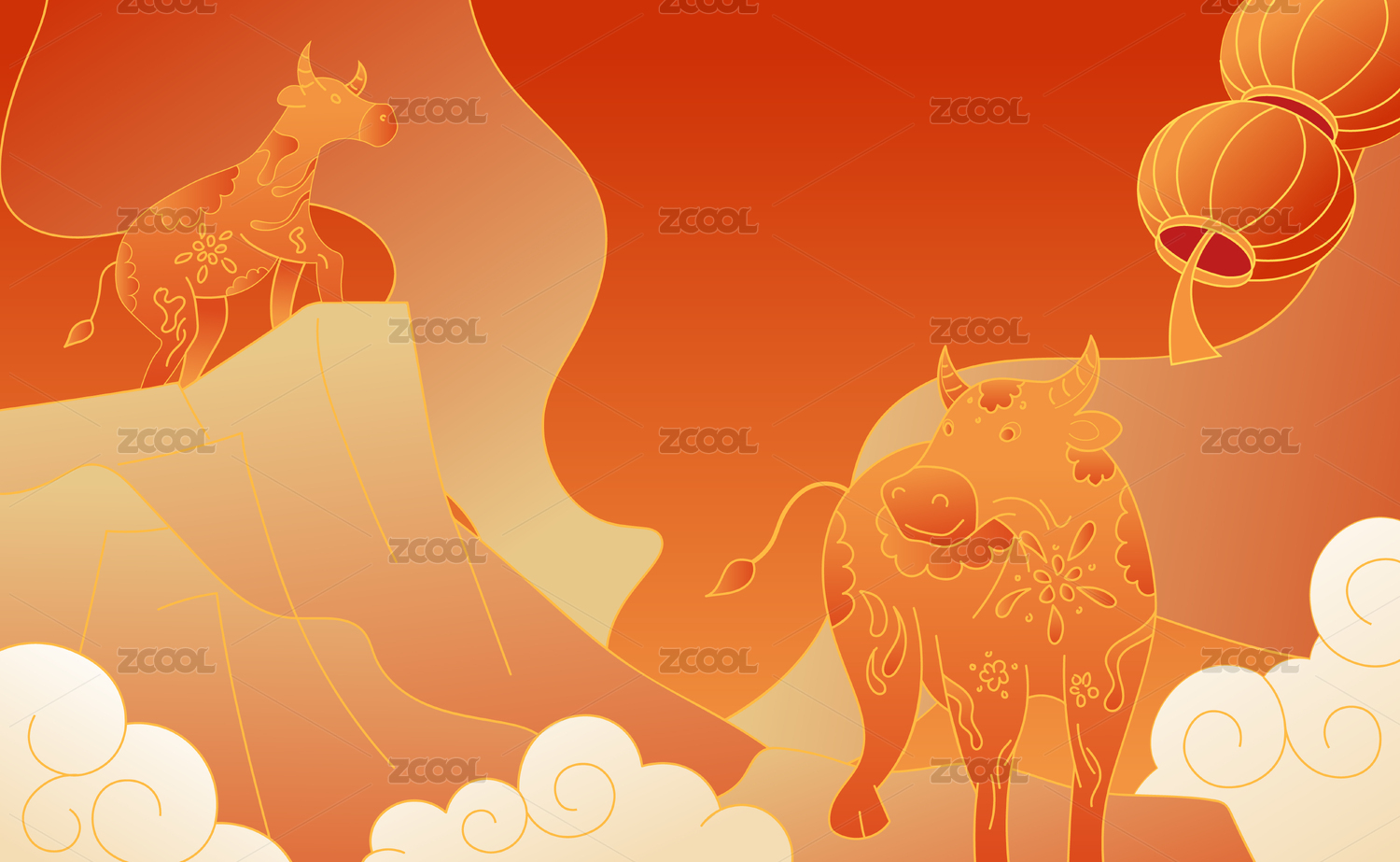 一个有牛,灯笼,祥云,山和树的牛年插画。