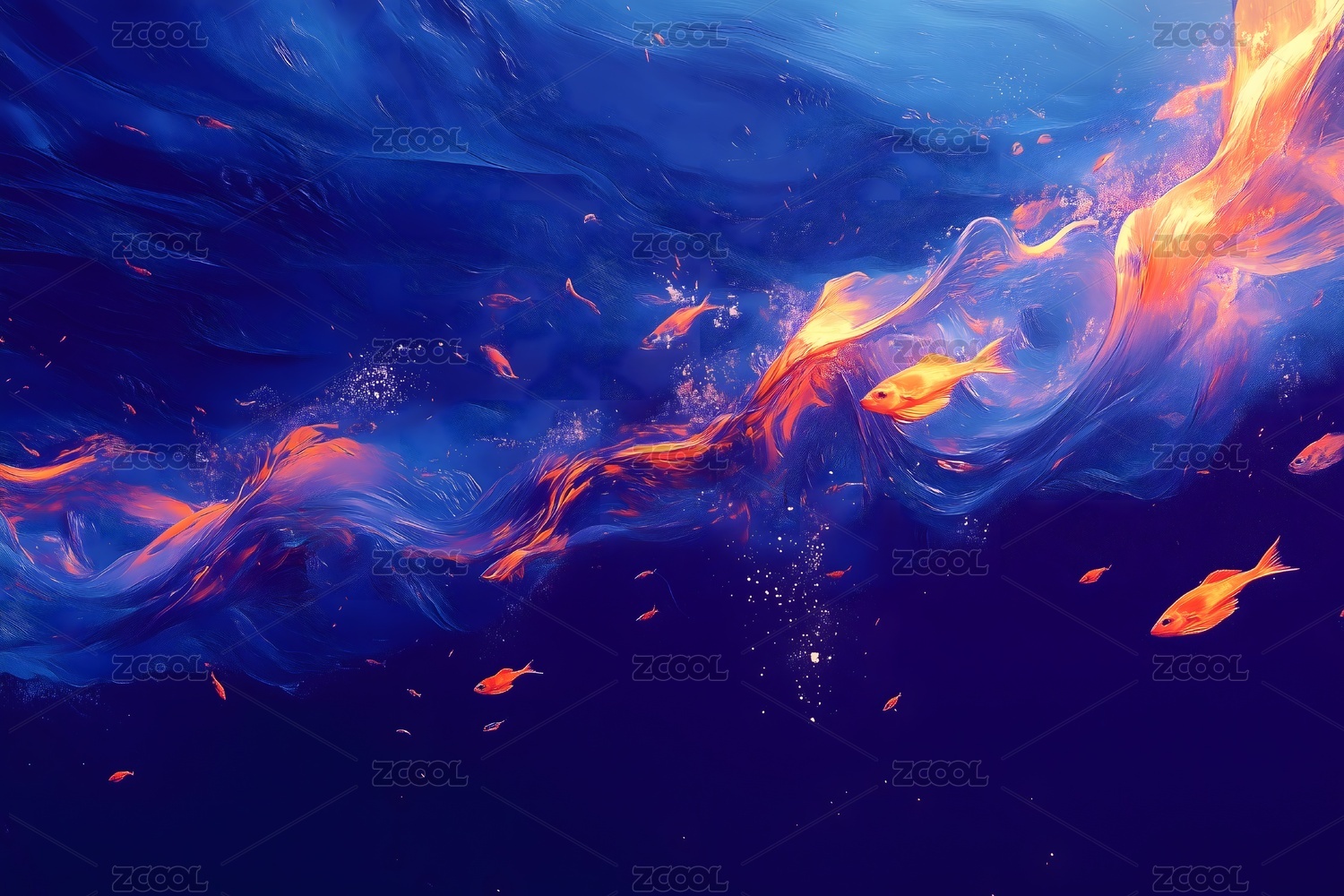 深蓝海洋中,金色鱼群穿梭于火焰般的漩涡