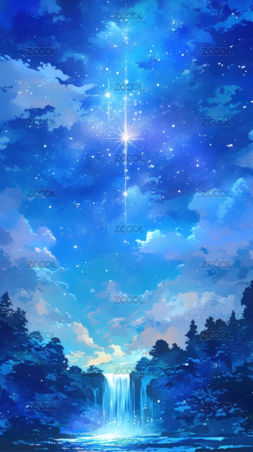星空下的瀑布森林夜景