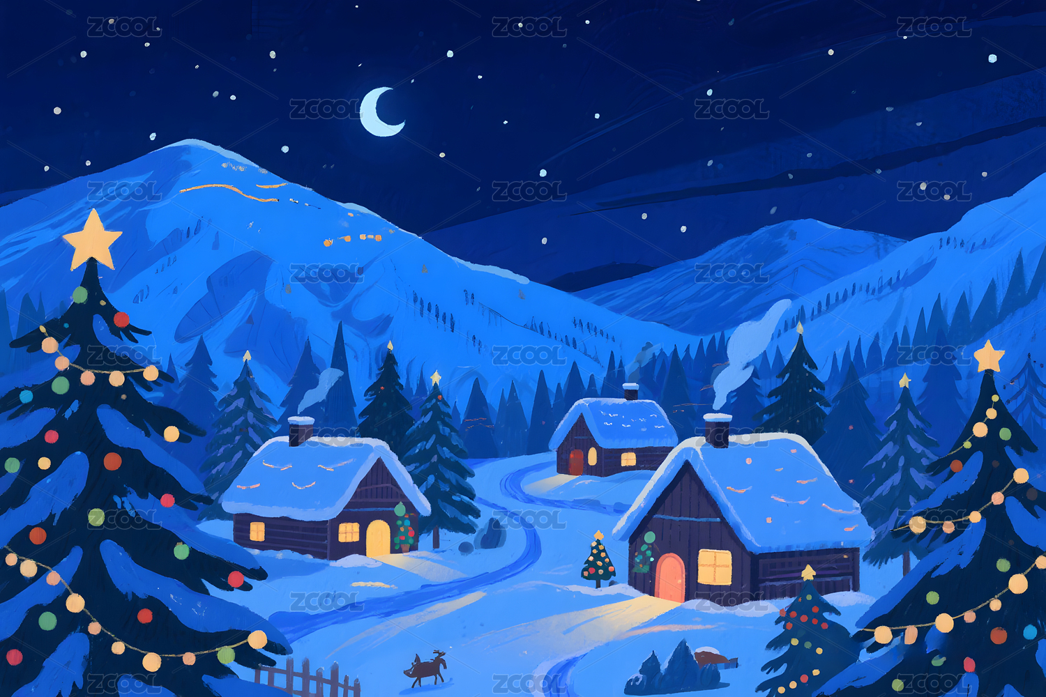 插画,树,圣诞节,季节,地形,雪,房屋,天空,森林,风景