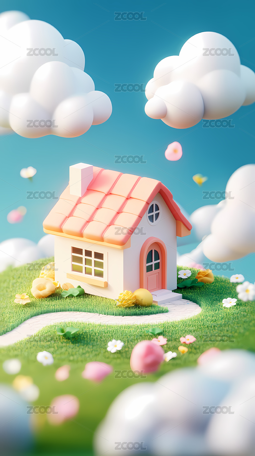 立夏节气户外房屋花草场景夏天旅行3D插画