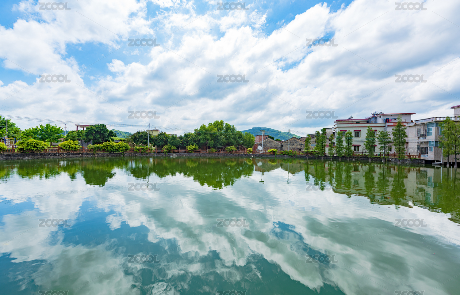 广东清远佛冈县上岳古村蓝天白云下的池塘