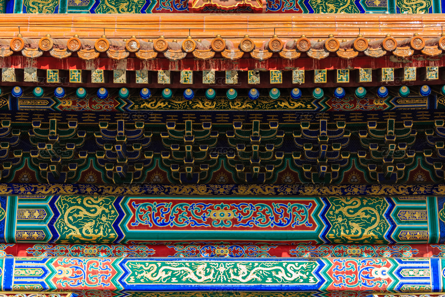 北京雍和宫明清皇家古建筑内的彩绘横梁