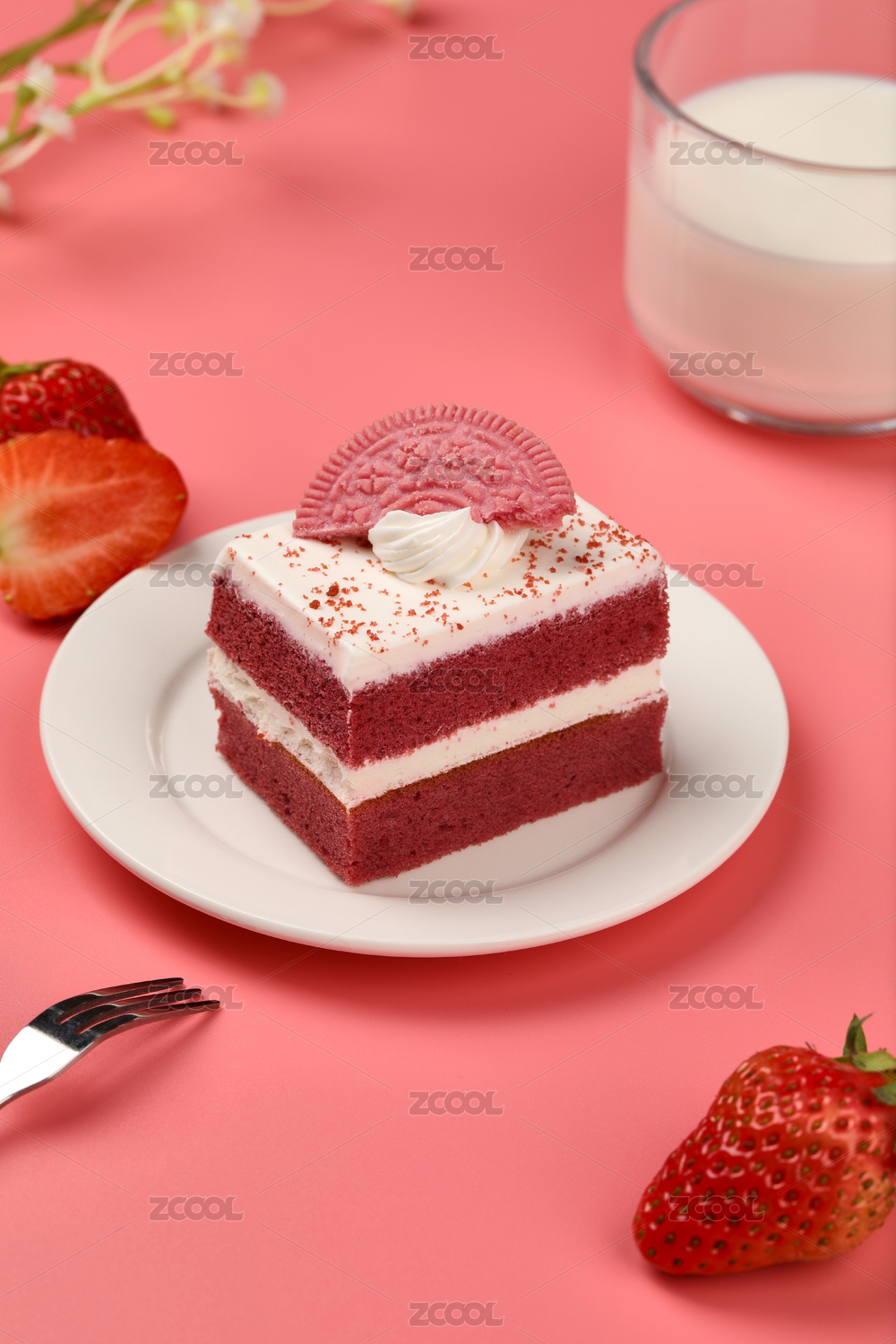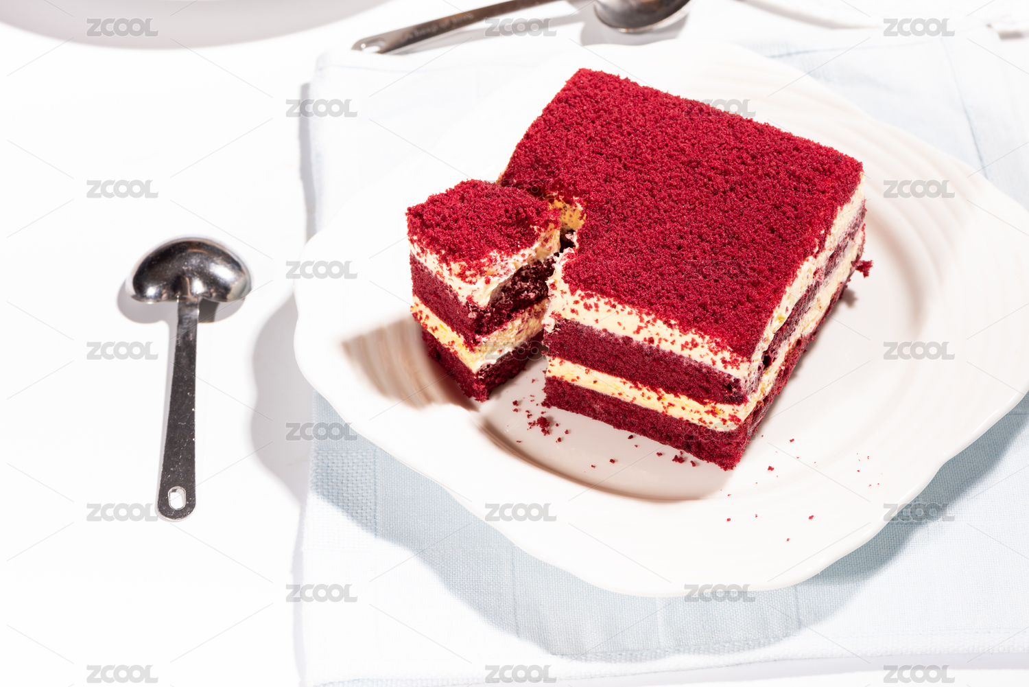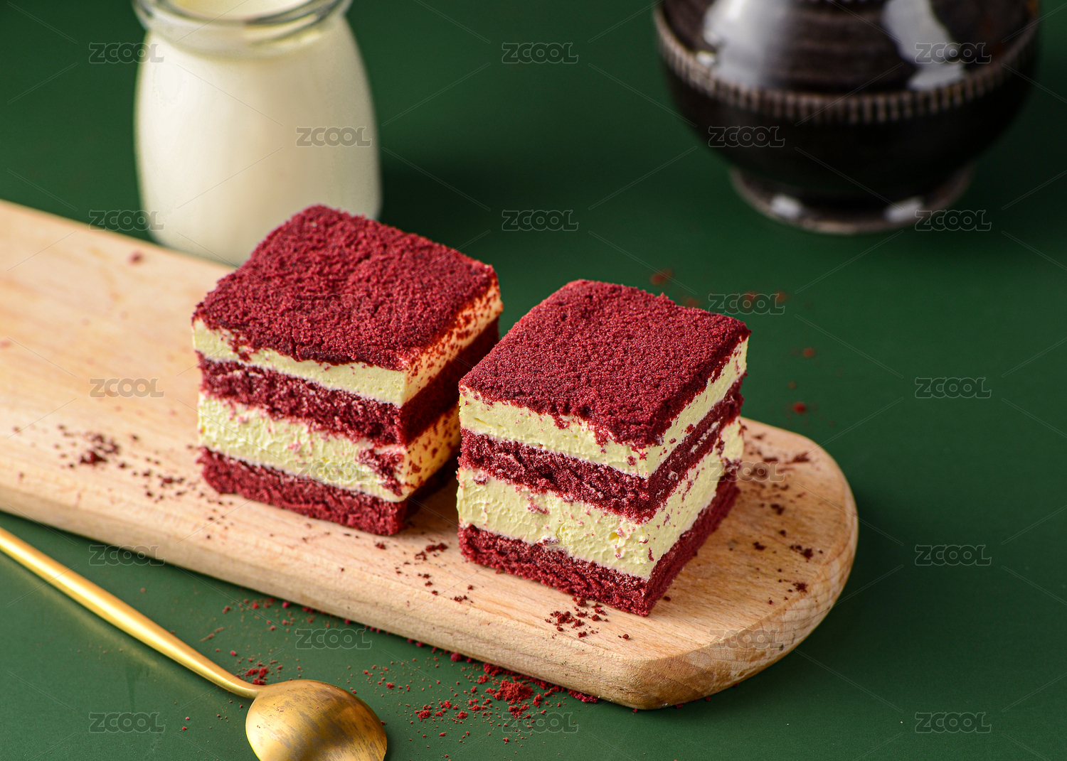 红丝绒蛋糕摆放在桌面上刀切蛋糕特写