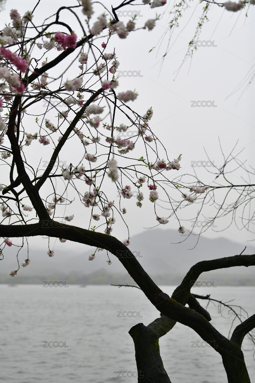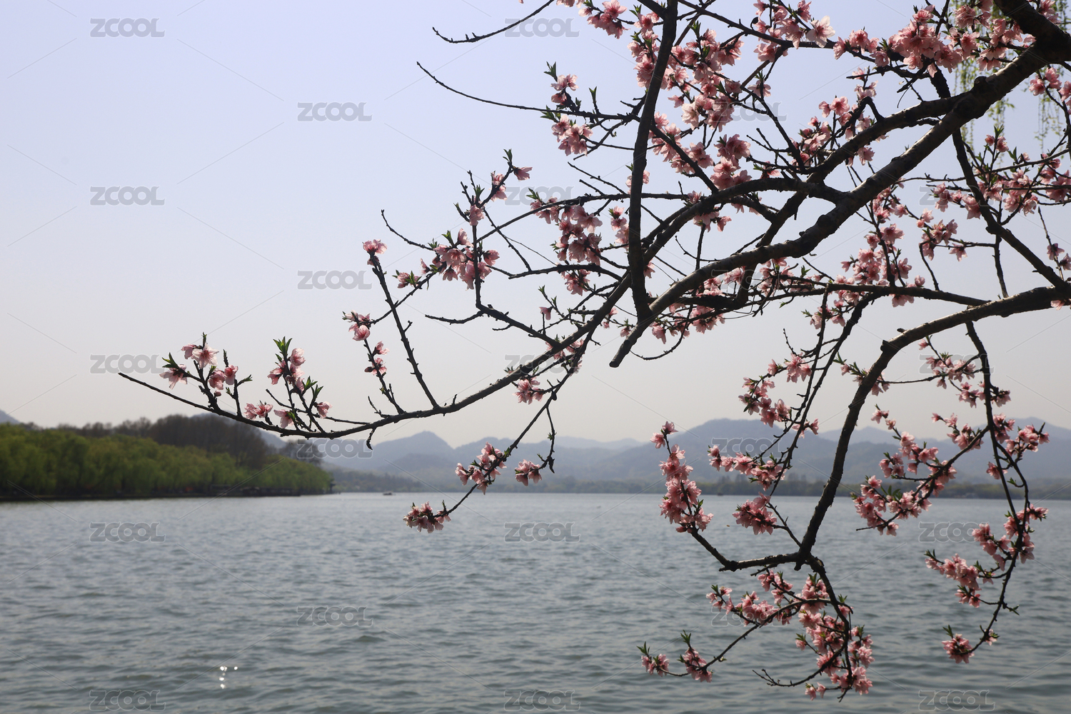 中国浙江省杭州西湖春天景观西湖畔多色桃花