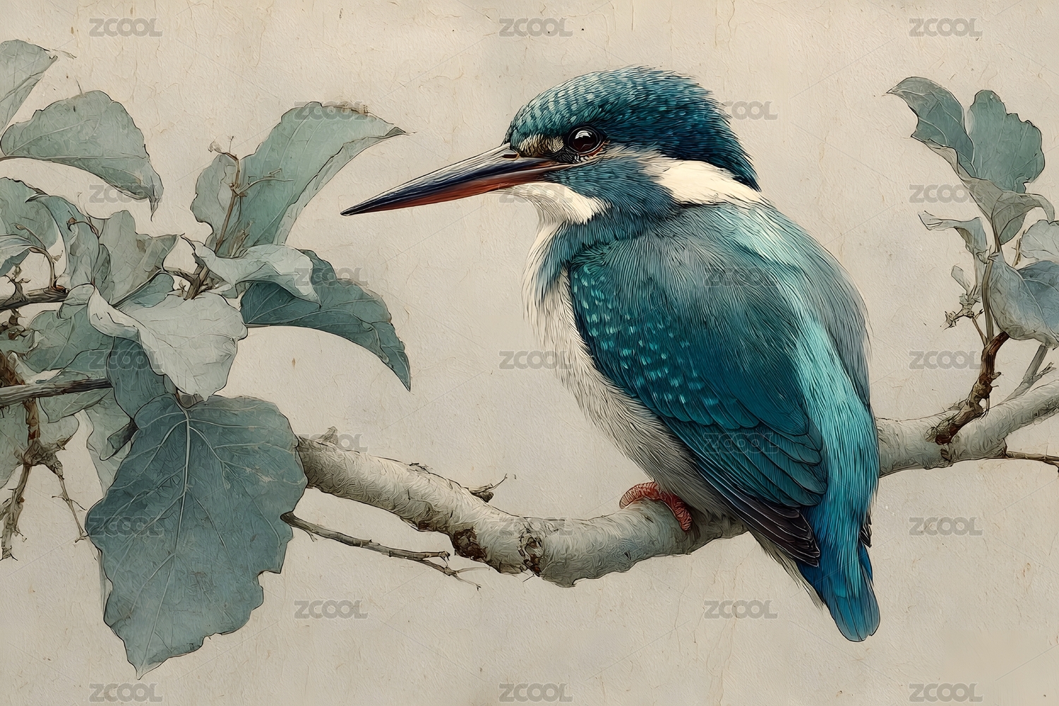 翠鸟栖息枝头,静谧水墨