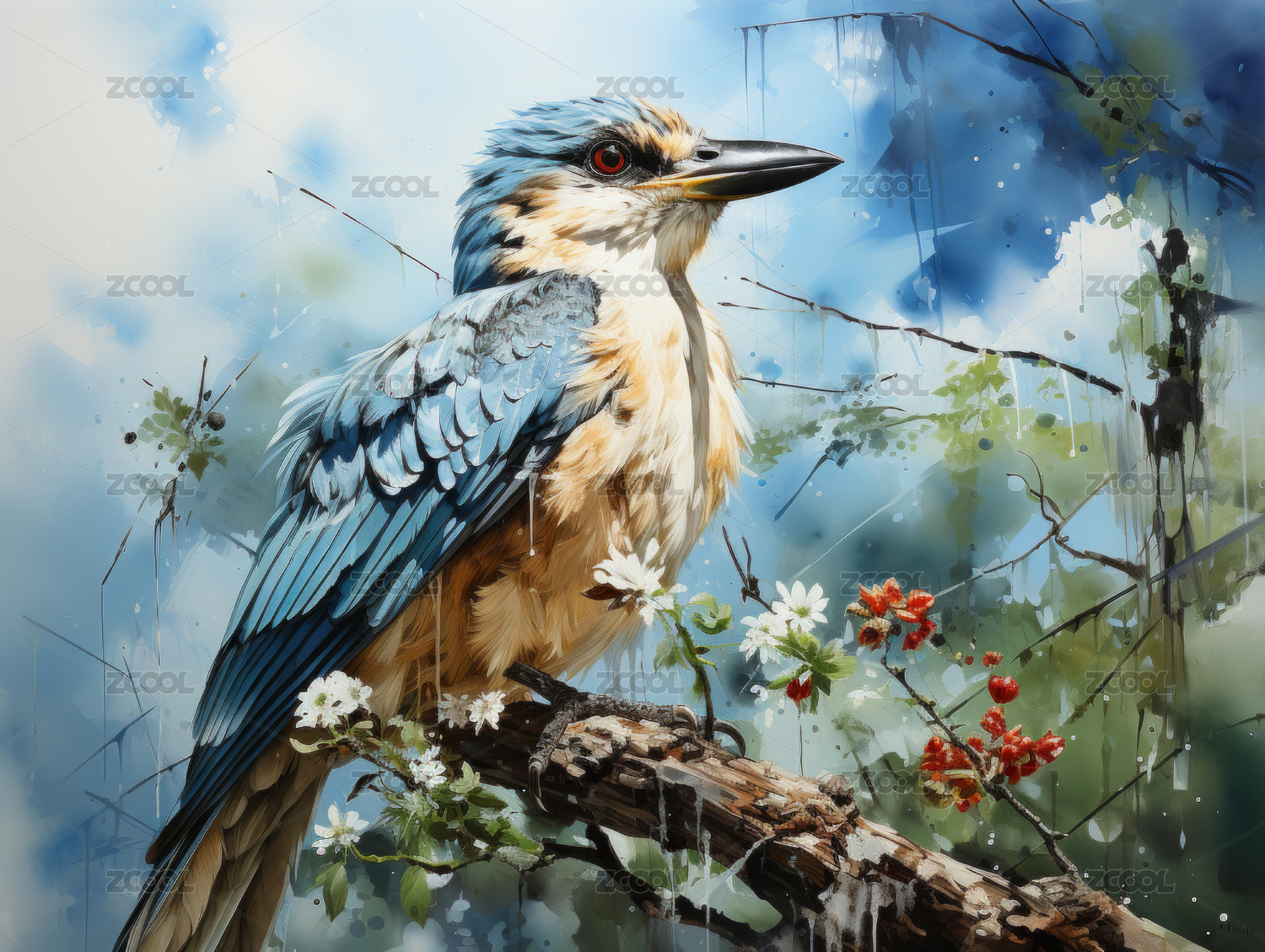 水彩翠鸟栖息枝头 蓝羽橙腹生动