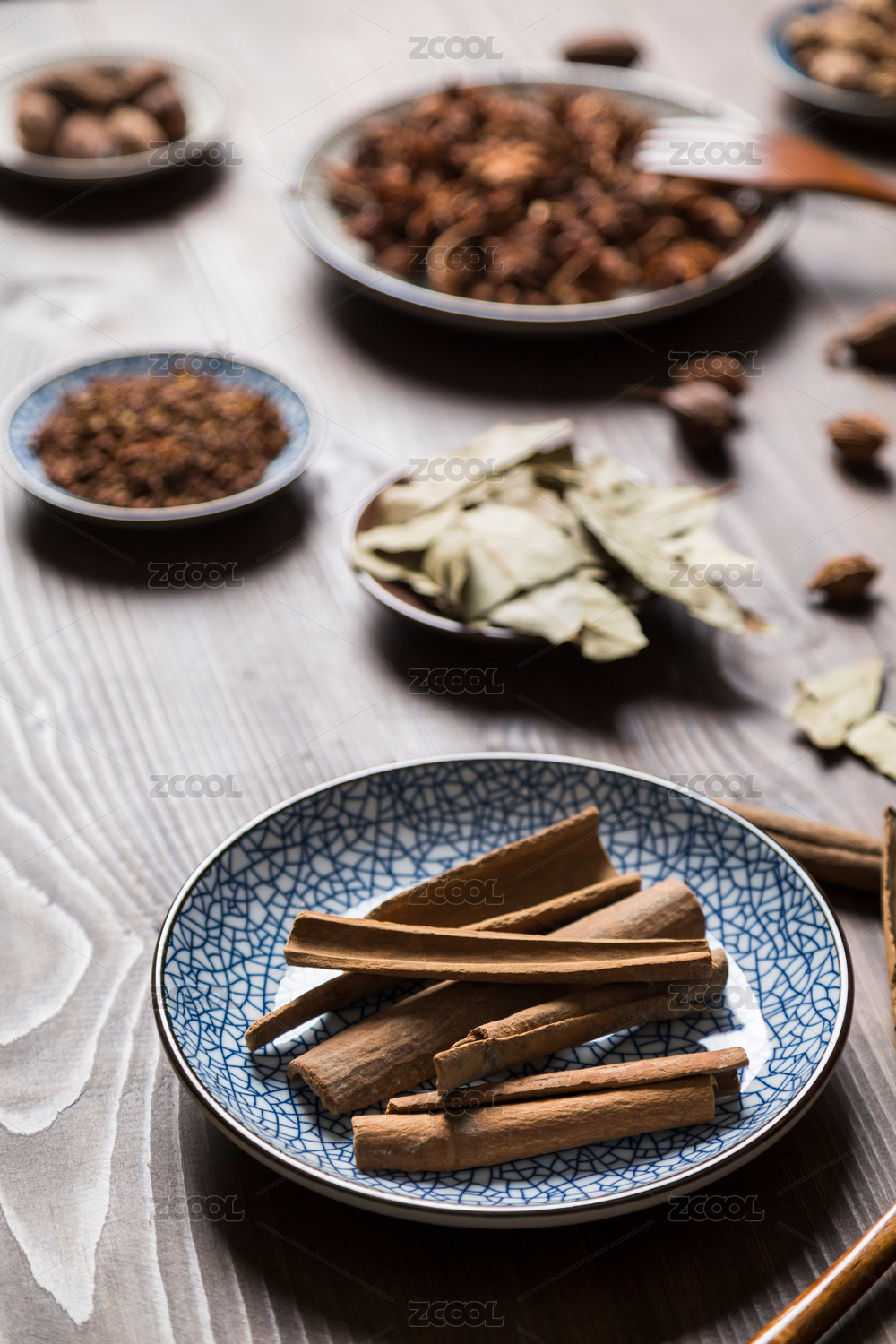 实木桌上种类繁多的中式调味香辛料