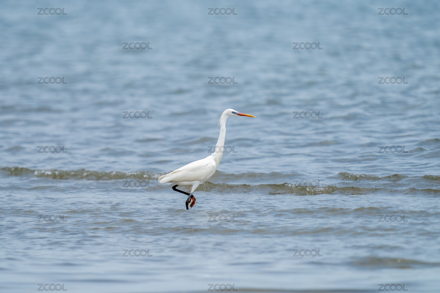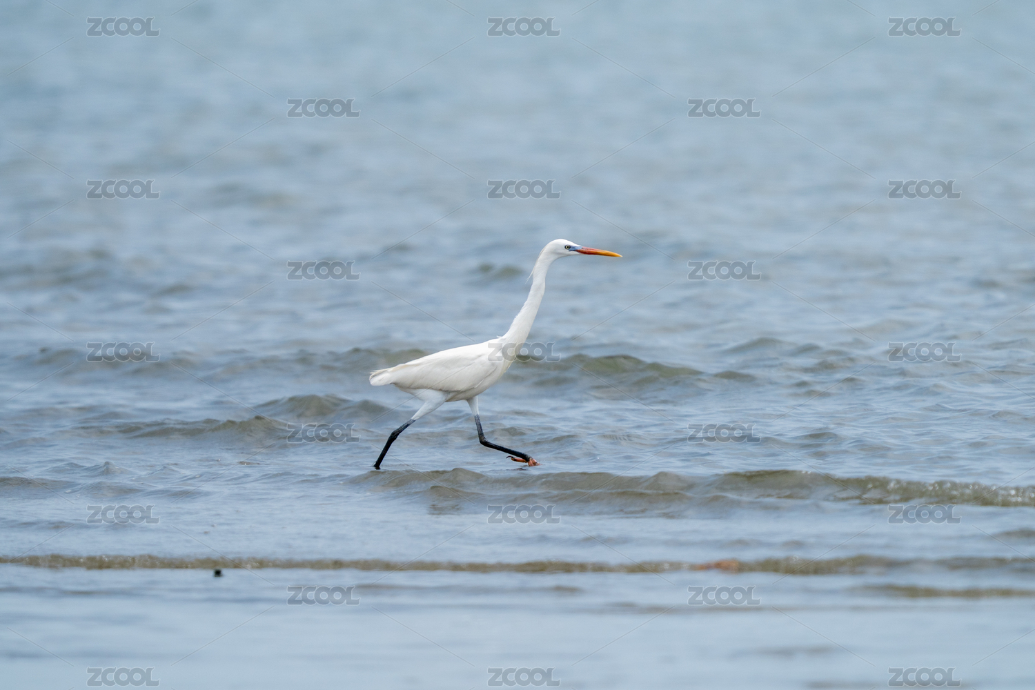 黄嘴白鹭鸟在海滩漫步于水中觅食
