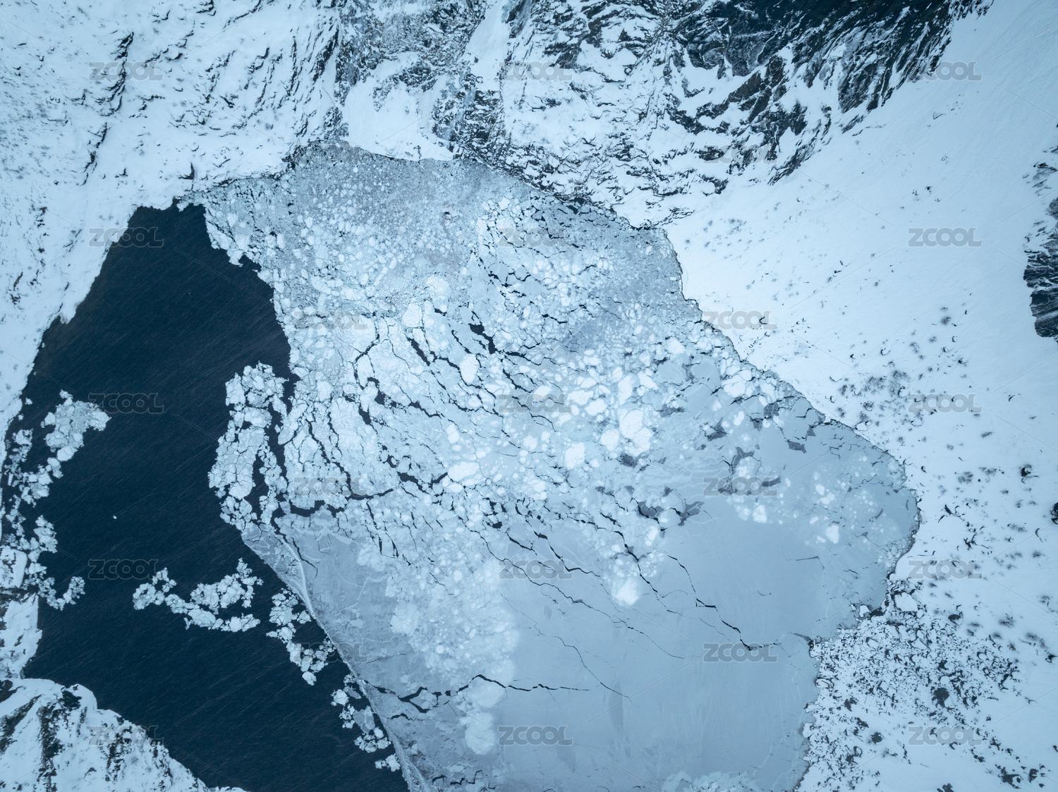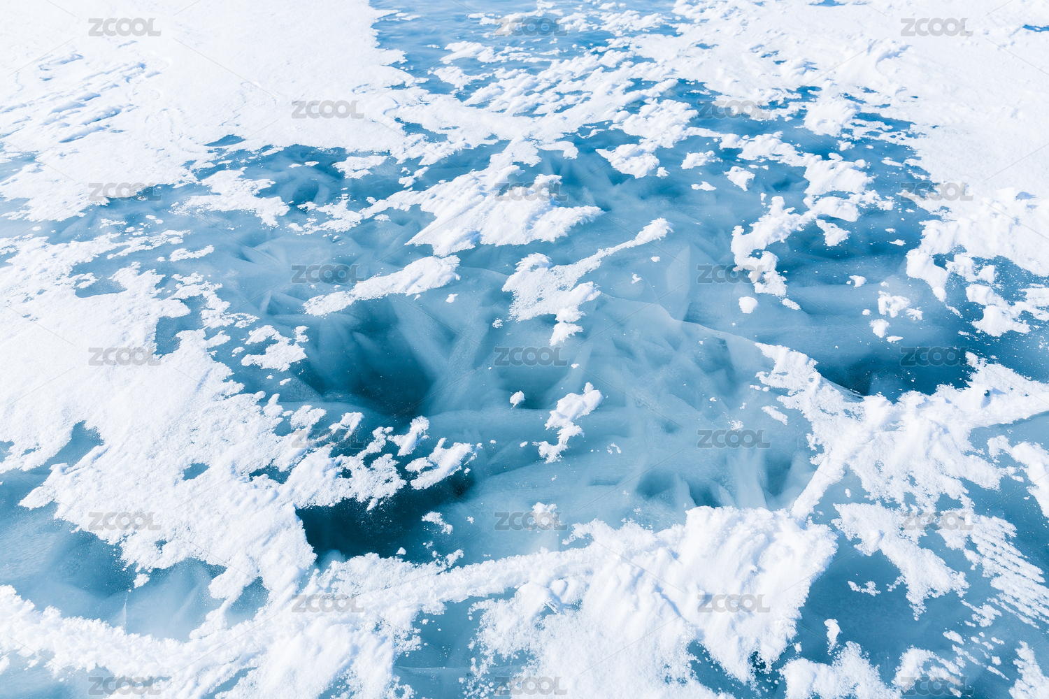 湖面结冰的纹路及冰面上的积雪