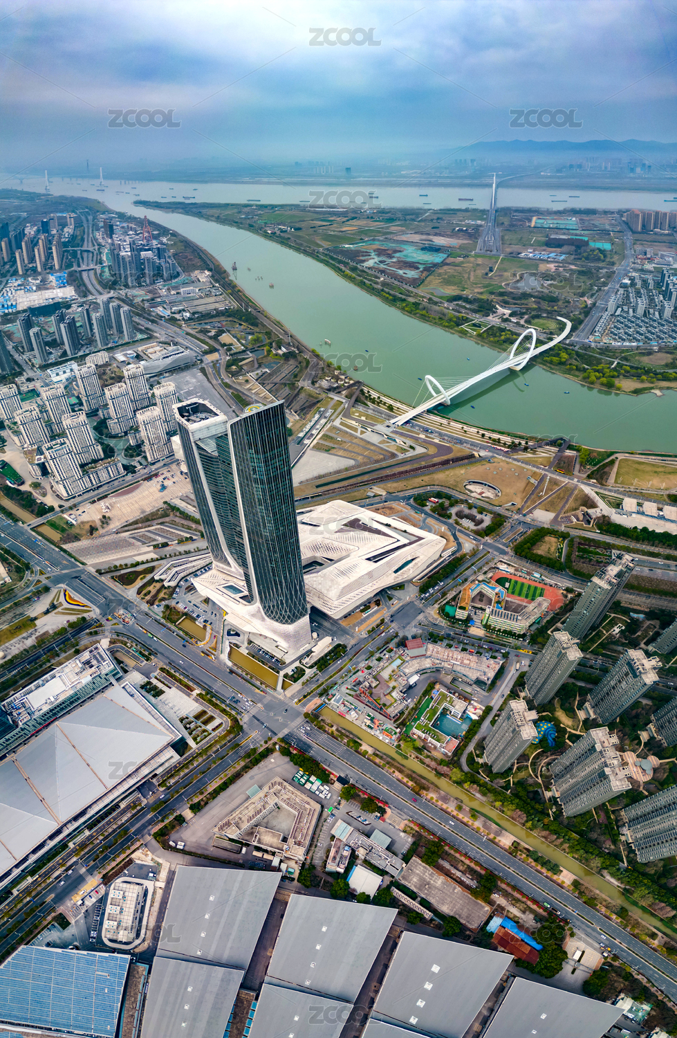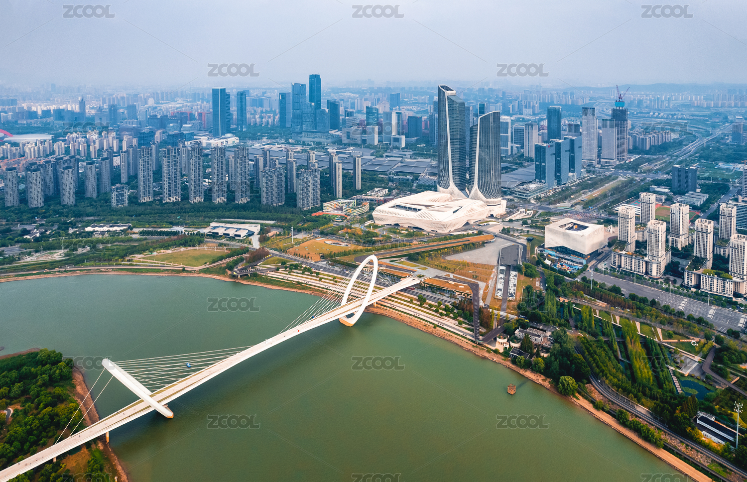 航拍南京青奥中心南京眼步行桥和保利大剧院