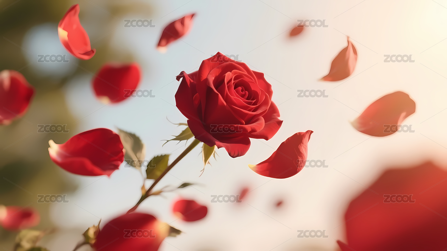 红色玫瑰与蓝天和飘落花瓣的浪漫氛围
