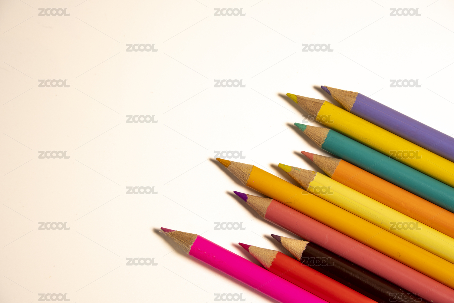 白底上一排彩色铅笔按一定的弧线整齐摆放