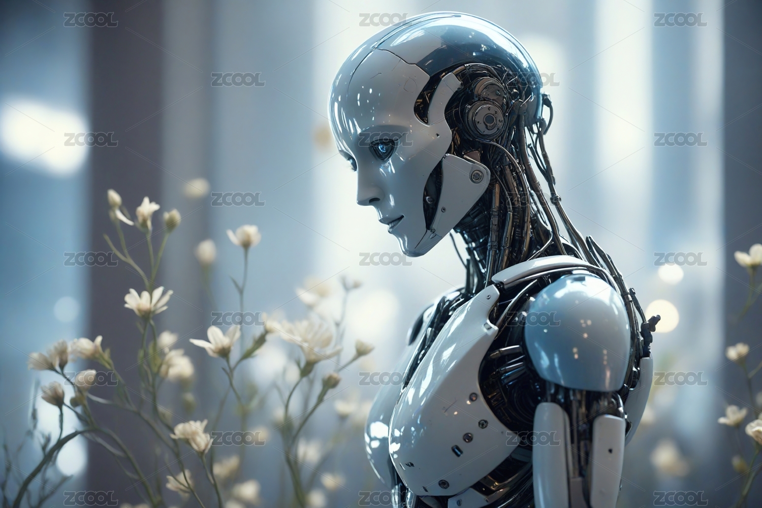 未来,机器人,人类,花朵,科技,梦幻,蓝色,光影,机械,生命