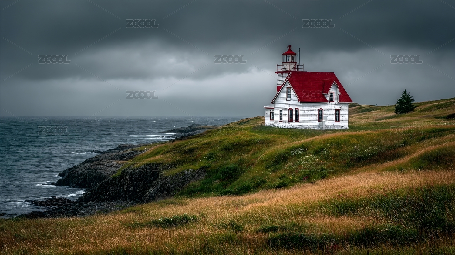海岸边的红顶灯塔