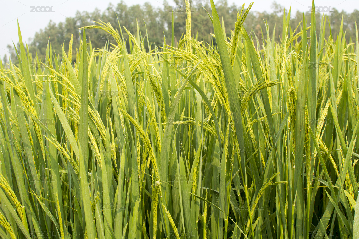 阳光照耀下,即将成熟的水稻在肥沃的田地里慢慢生长特写