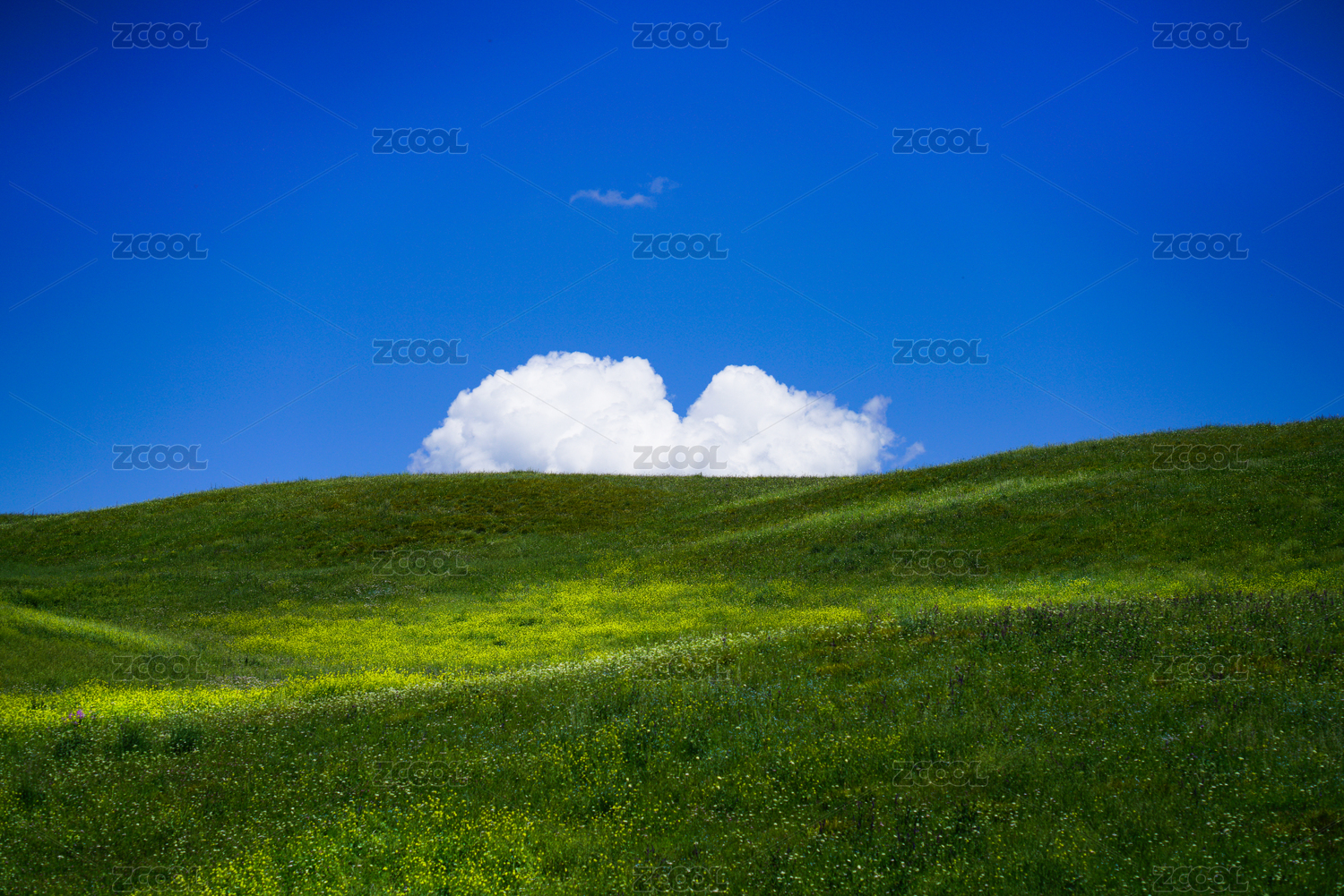 中国新疆夏季晴天蓝色天空下绿色的大草原