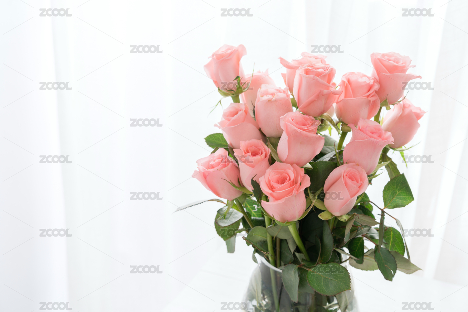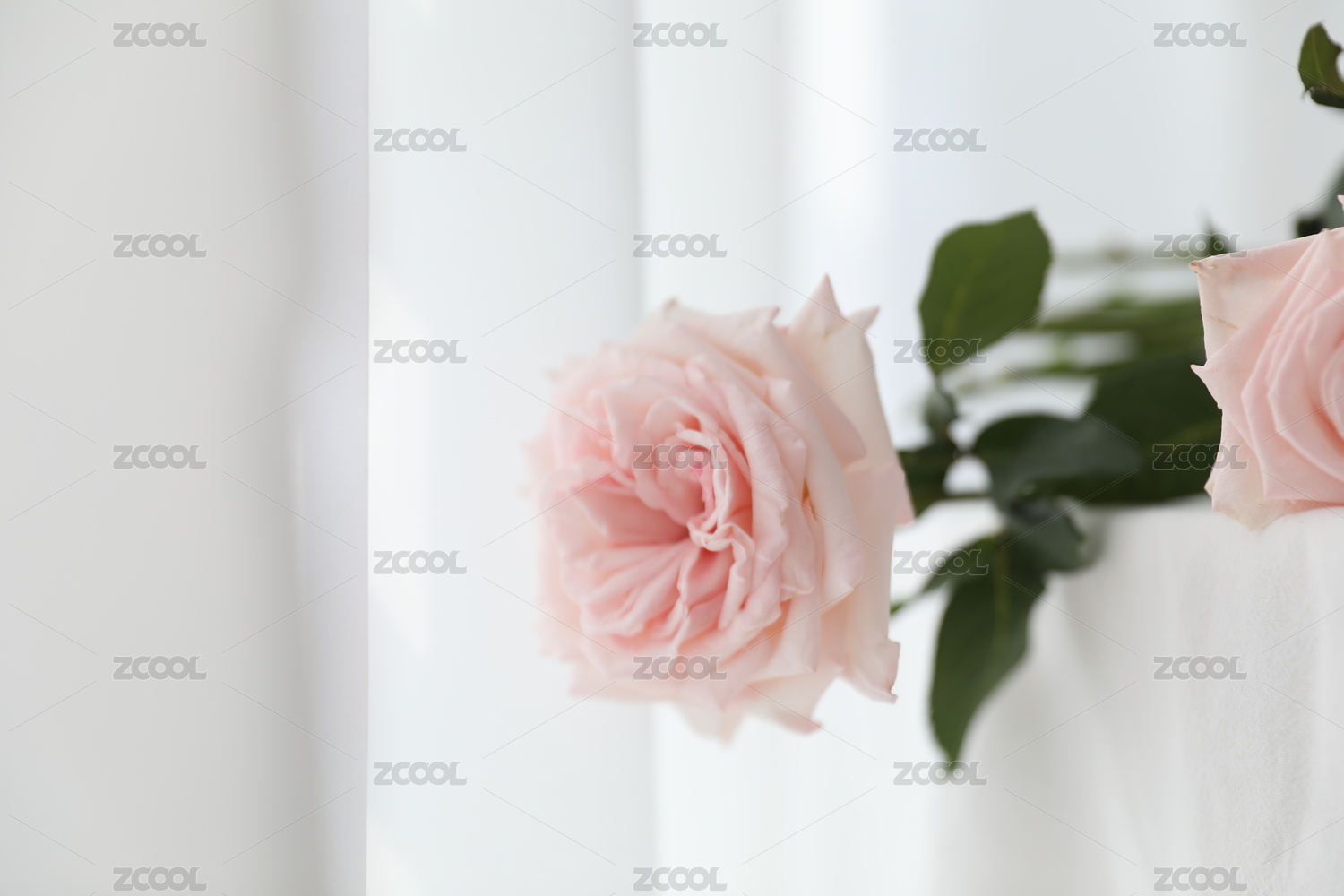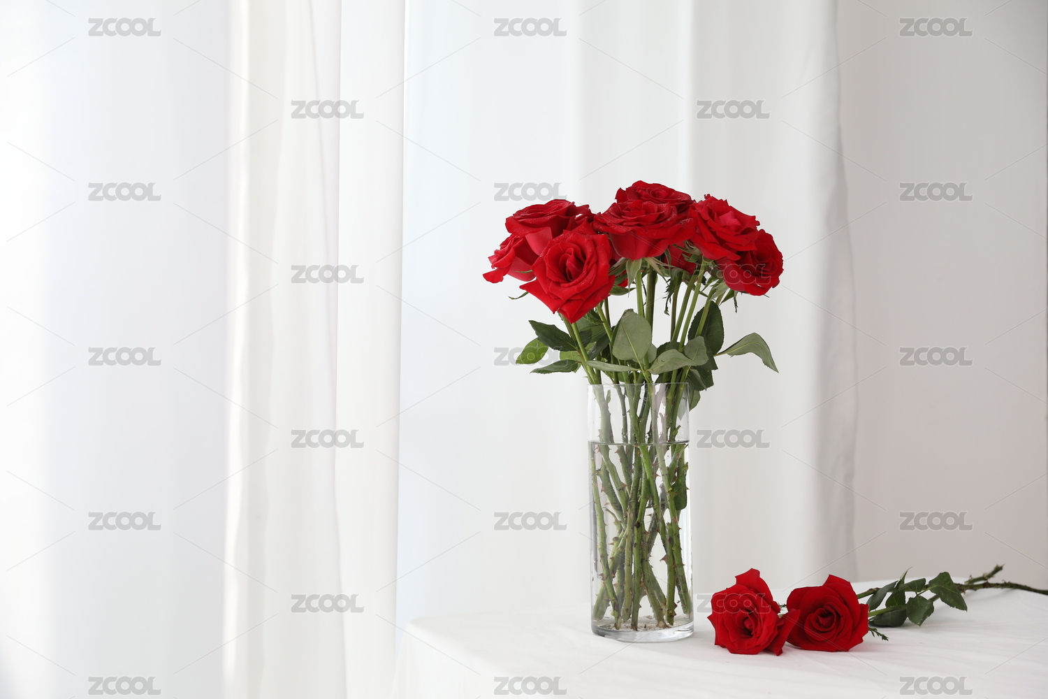 玻璃花瓶里的玫瑰花在白色的桌子上