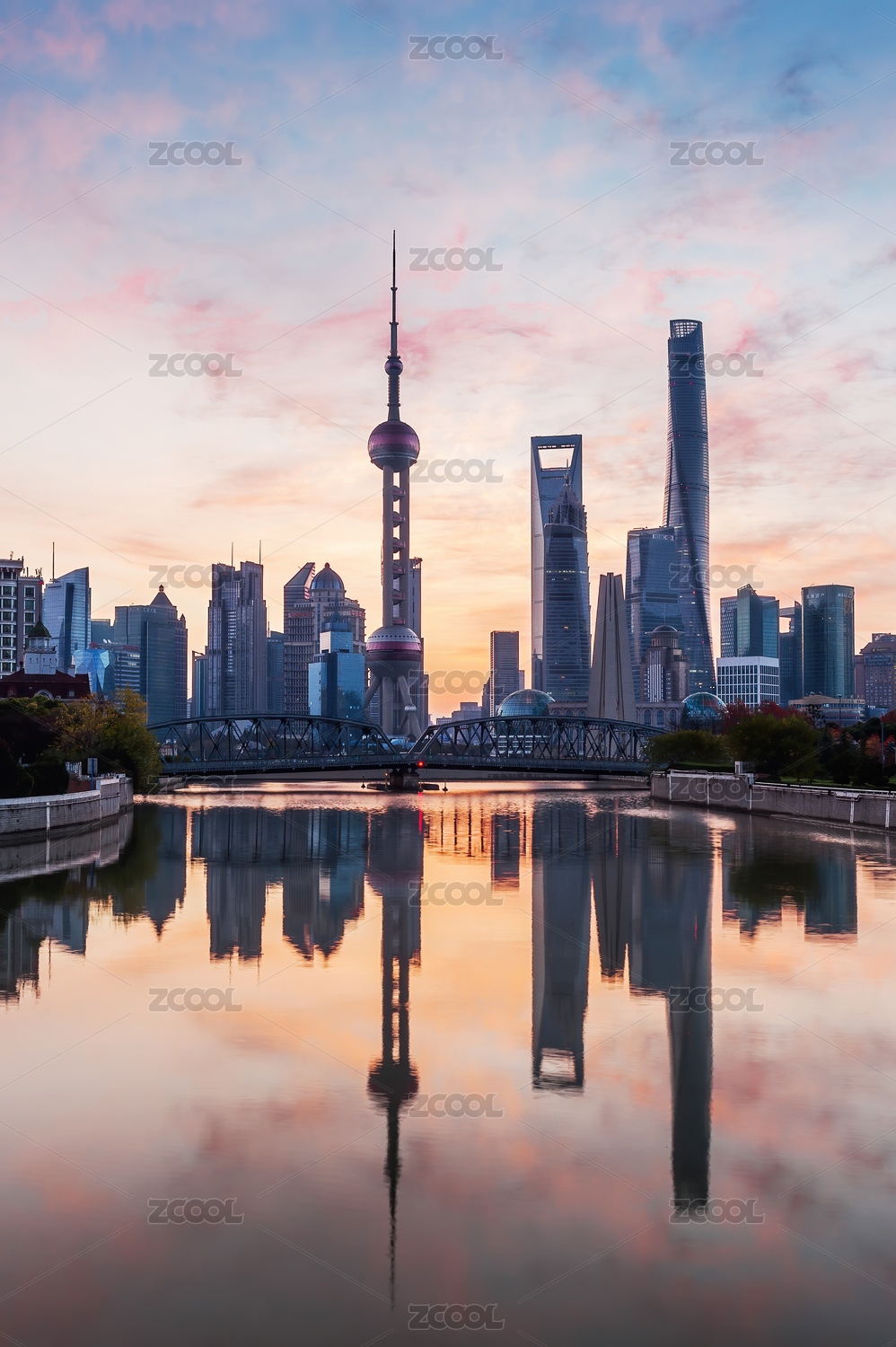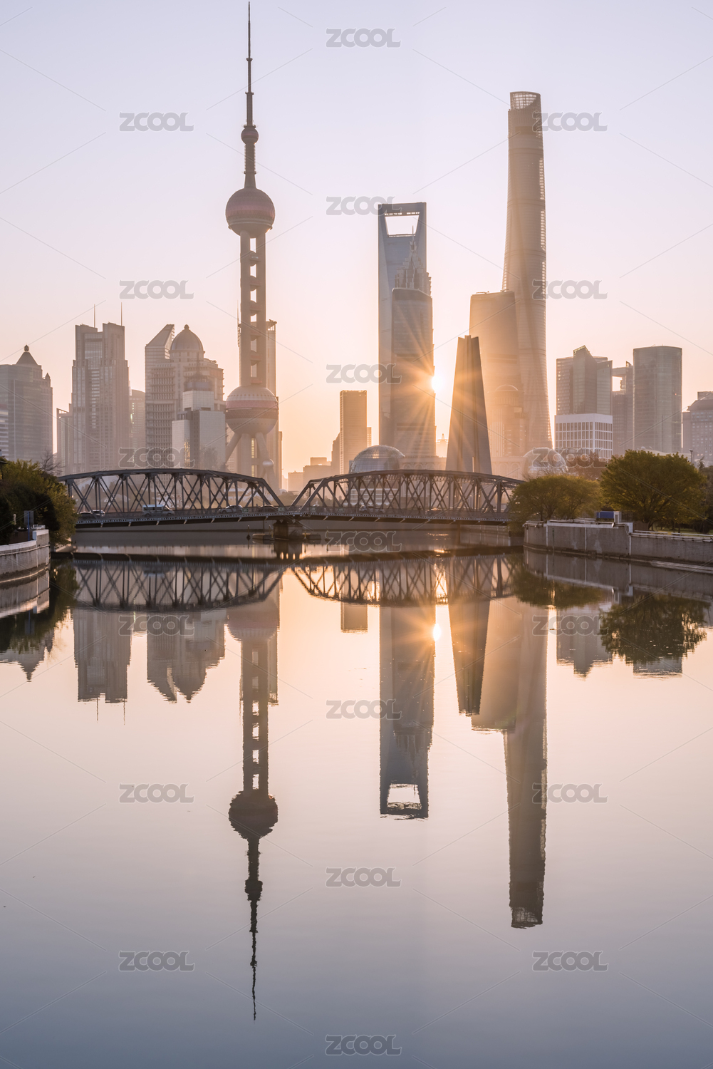 日出下的上海苏州河外白渡桥沿岸城市CBD